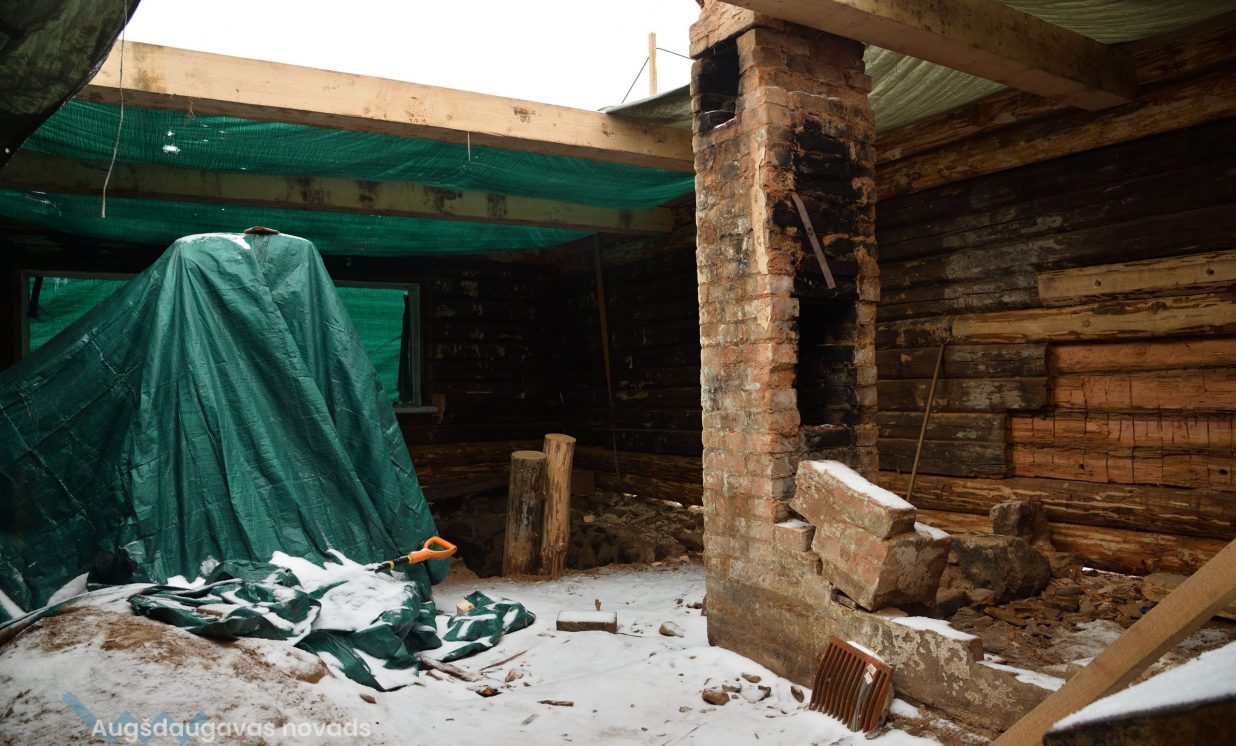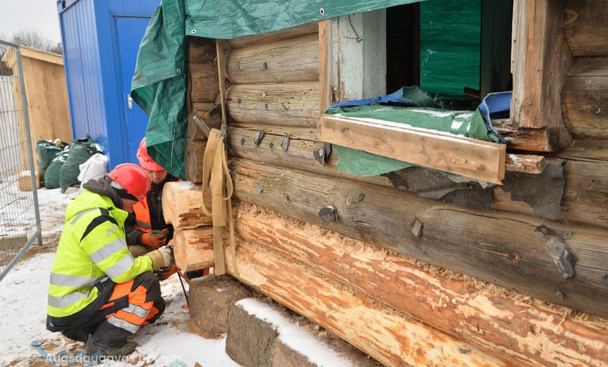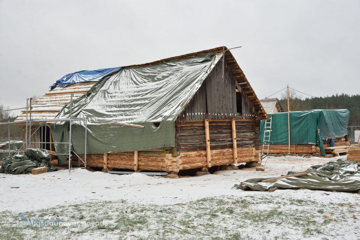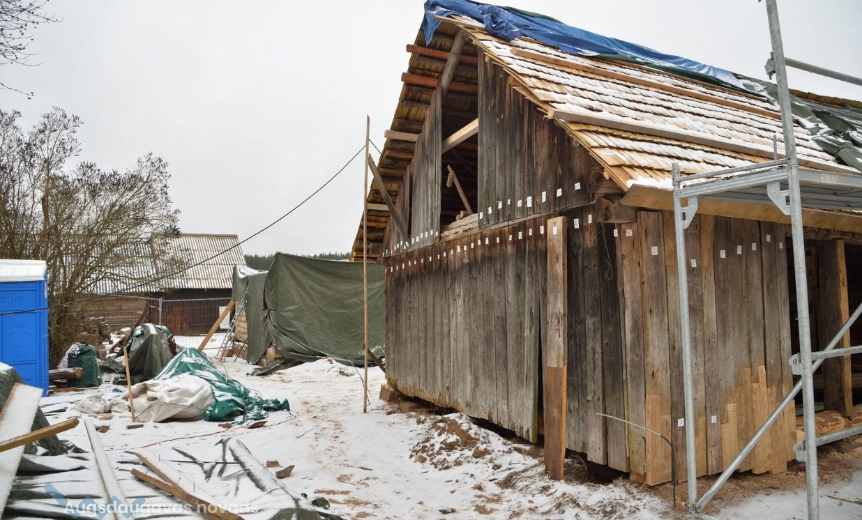 Būvprojektu izstrādājusi SIA “Ināras Caunītes birojs”, būvdarbus veic SIA “WARSS +”, bet būvuzraudzību -- AS Būvuzņēmums “Restaurators”. Darbi pamazām rit uz priekšu. Ar domkratu guļbūves tiek saudzīgi piepaceltas no akmens pamatiem, lai varētu nomainīt vai restaurēt atsevišķas detaļas. Daudzus baļķus neglābjami sabojājis laika zobs un ķirmji, tāpēc tie tiek aizstāti ar jauniem, taču lielākoties būvnieki cenšas saglabāt oriģinālās konstrukcijas. Šķūnim jau ieklāts jauns skaidu jumts veca šīfera vietā. Uzņēmums SIA “WARSS +” specializējas tieši guļbūvju restaurācijā. Uzņēmuma pārstāvji atzīst, ka ir nācies atjaunot ēkas, kas ir daudz sliktākā stāvoklī un praktiski būtu jānojauc, vietā veidojot analogu, taču šajā gadījumā dažas konstrukcijas vēl varot saglābt un atjaunot. Katrs dēlis ir sanumurēts, lai pēc tā noņemšanas un restaurācijas atgrieztos savā vietā. Dažas detaļas tiek vestas atjaunot uz darbnīcām, taču lielākoties visi darbi tiek veikti uz vietas. Saskaņā ar līgumu visi būvdarbi jāpabeidz līdz jūnijam.