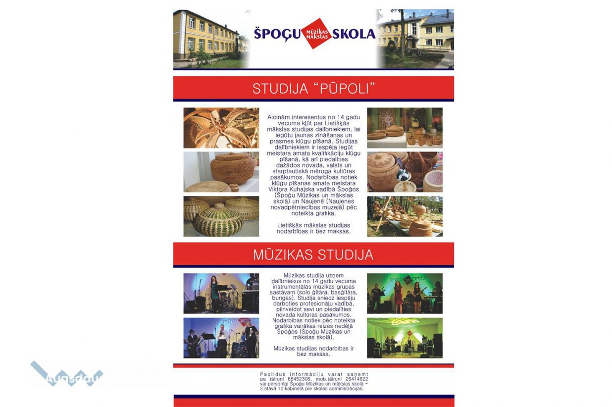 Papildus informāciju var saņemt pa tālruni 654 52306, mob. tālruni 26414622 vai personīgi Špoģu Mūzikas un mākslas skolā –2.stāvā 12.kabinetā pie skolas administrācijas.