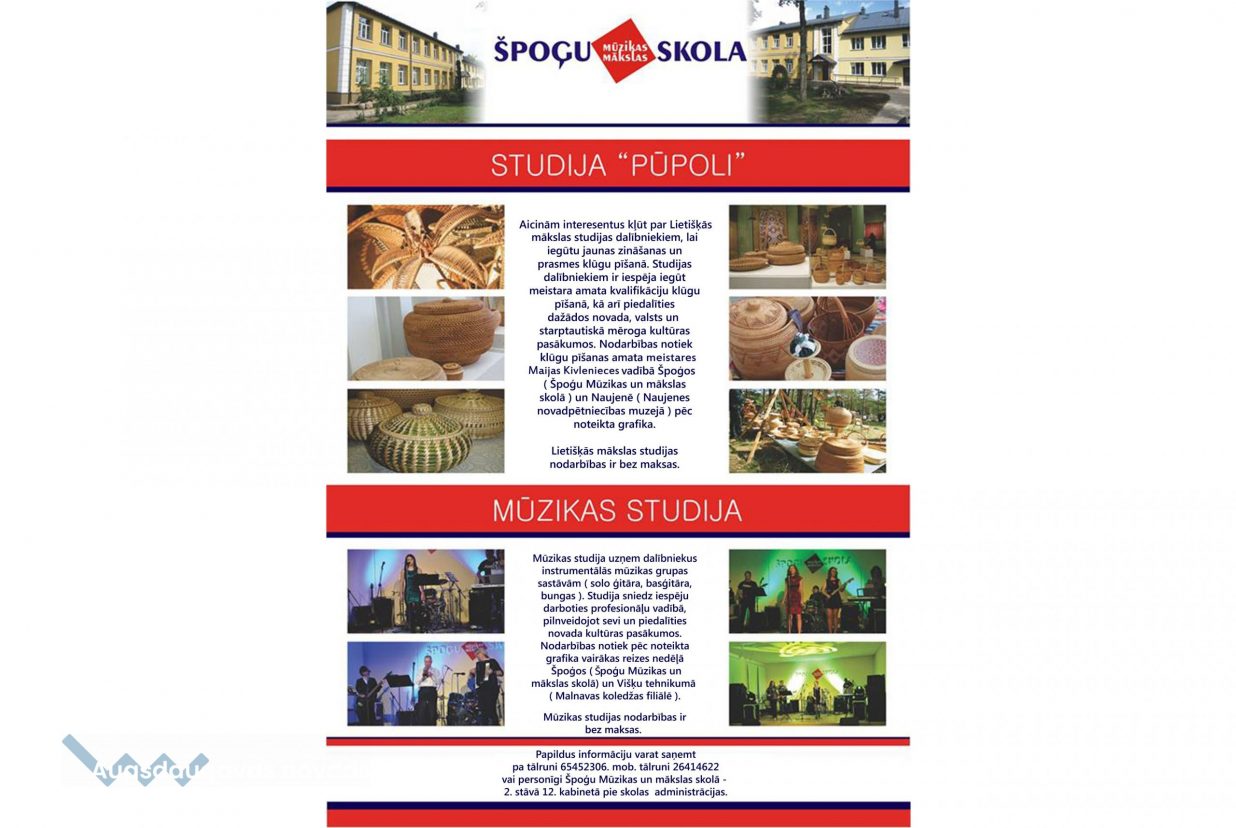 NovadsAktualitātesJaunumiŠpoģu Mūzikas un mākslas skola aicina nodarboties mākslas un mūzikas studijās