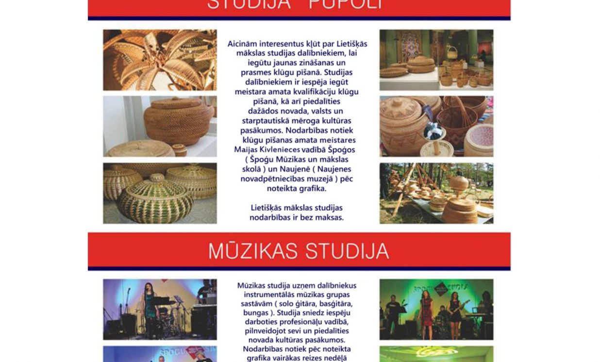 Aicinām visus interesentus kļūt par Lietišķās mākslas studijas dalībniekiem, lai iegūtu jaunas zināšanas un prasmes klūgu pīšanā. Studijas dalībniekiem ir iespēja iegūt meistara amata kvalifikāciju klūgu pīšanā, kā arī piedalīties dažādos novada, valsts un starptautiskā mēroga kultūras pasākumos. Nodarbības notiek klūgu pīšanas amata meistares Maijas Kivlenieces vadībā Špoģos (Špoģu Mūzikas un mākslas skolā) un Naujenē (Naujenes novadpētniecības muzejā) pēc noteikta grafika.