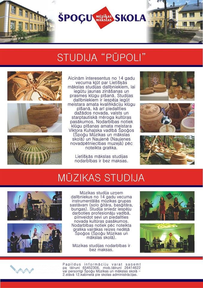 Špoģu Mūzikas un mākslas skola aicina visus interesentus uz nodarbībām lietišķās mākslas studija "Pūpoli". Studijas dalībniekiem ir iespēja iegūt zināšanas un prasmes klūgu pīšanā, kļūt par amata meistaru klūgu pīšanā, kā arī piedalīties dažādos novada, valsts un starptautiska mēroga kultūras pasākumos. Nodarbības notiek amata meistara Viktora Kuhaļska vadībā Špoģos (Špoģu Mūzikas un mākslas skolā) un Naujenē (Naujenes Novadpētniecības muzejā) pēc noteikta grafika. Lietišķās mākslas studijas nodarbības ir bez maksas.