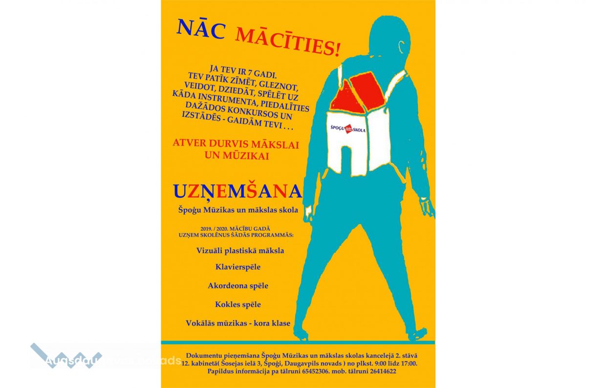 Papildus informāciju var saņemt pa tālruni 654 52306, mob.tālruni 26414622 vai personīgi Špoģu Mūzikas un mākslas skolā – 2.stāvā 12.kabinetā pie skolas administrācijas.