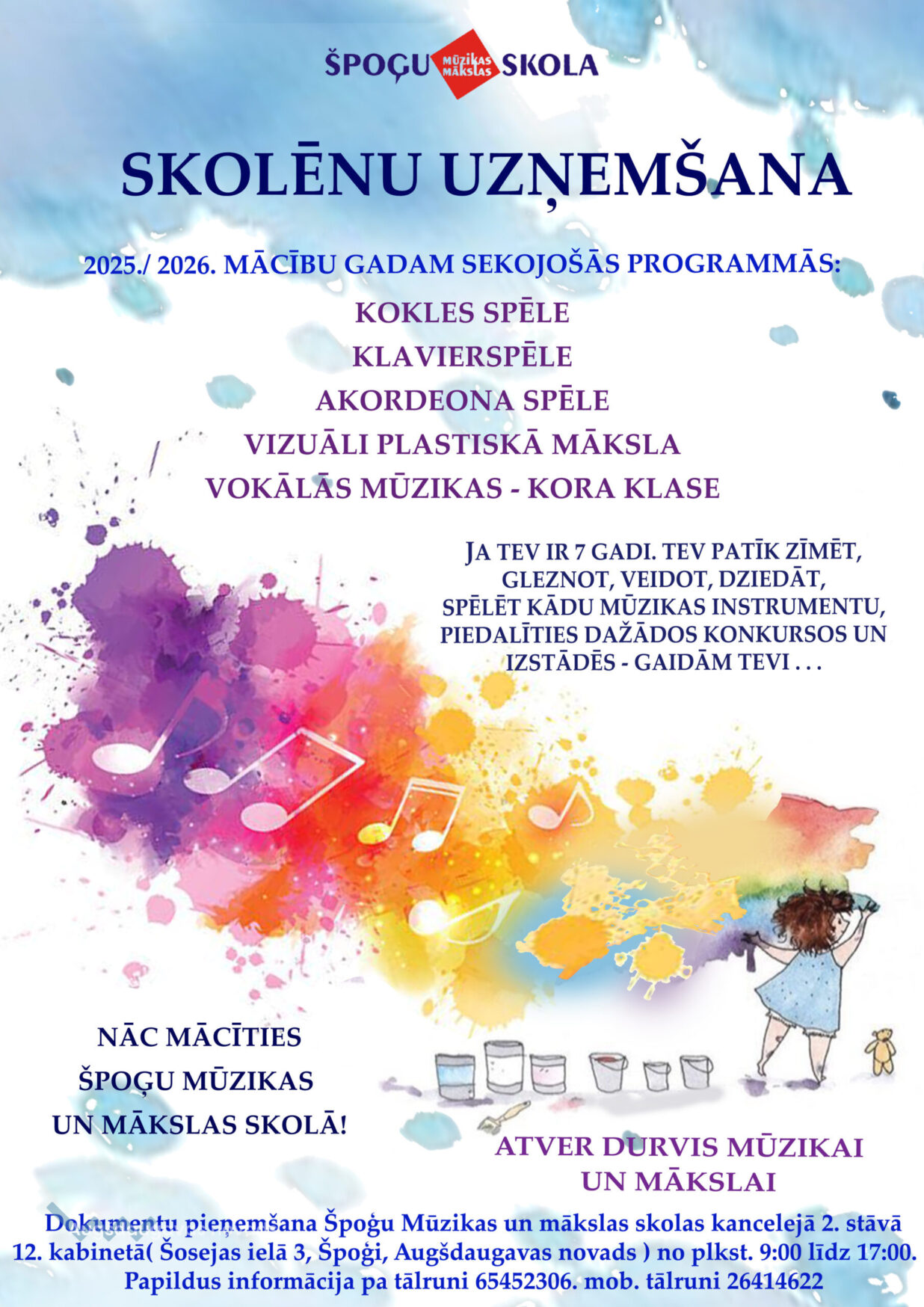 Špoģu Mūzikas un mākslas skola uzsāk izglītojamo uzņemšanu 2025./2026. mācību gadam