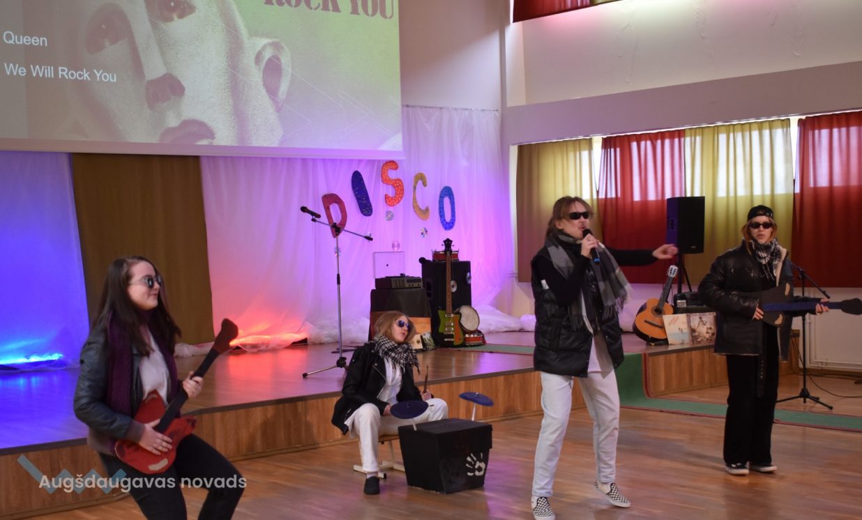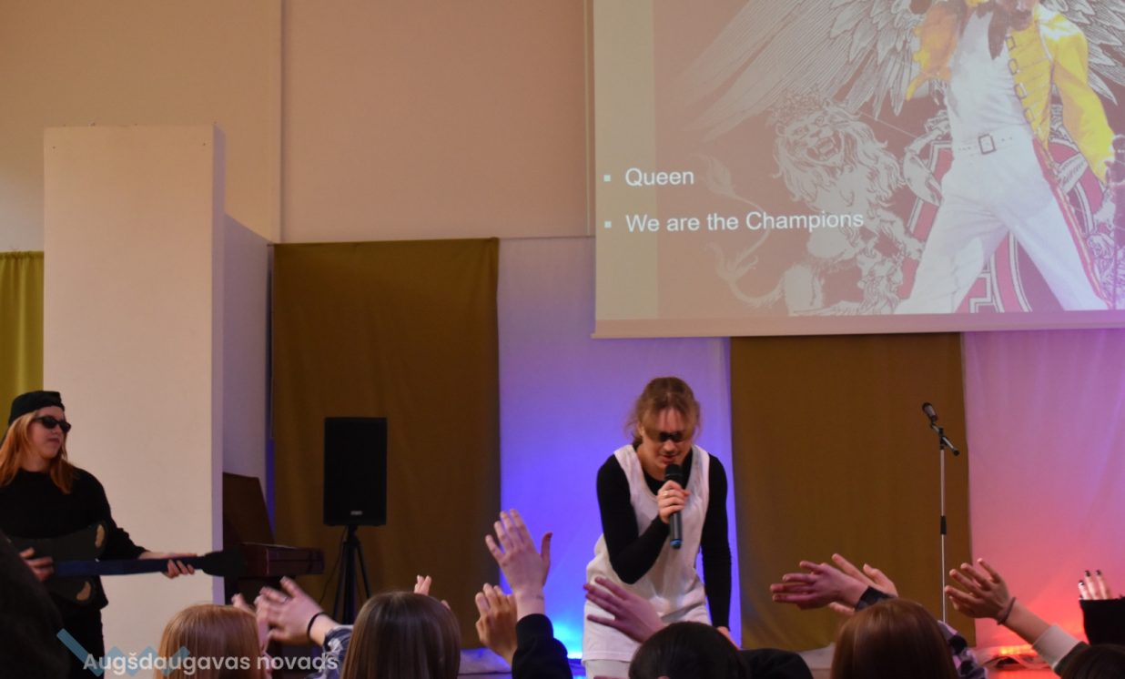 Pasākumu ievadīja 8.a klase ar grupas Queen 2 dziesmām "We Will Rock You" un "We Are the Champions", pārstāvot 70.- tos gadus.