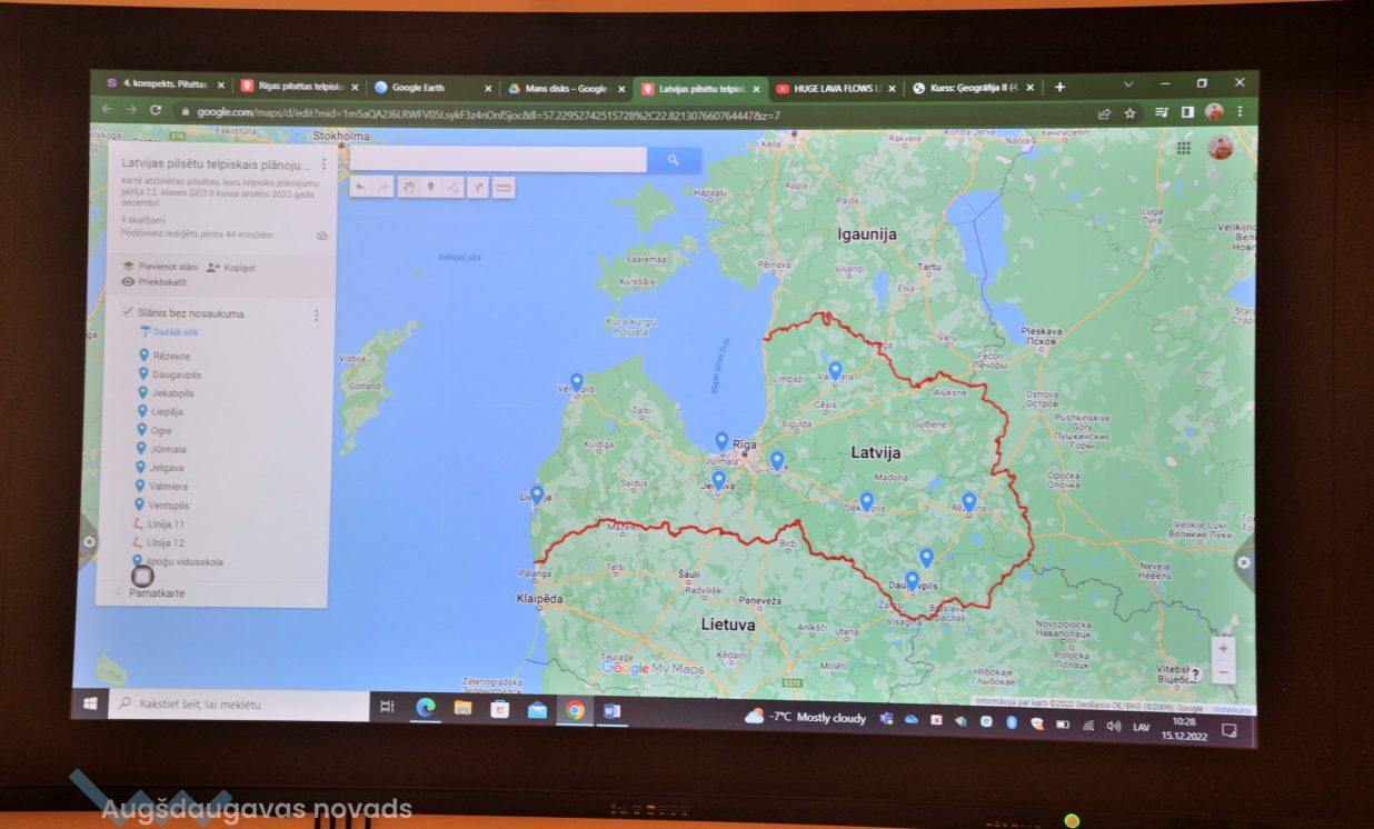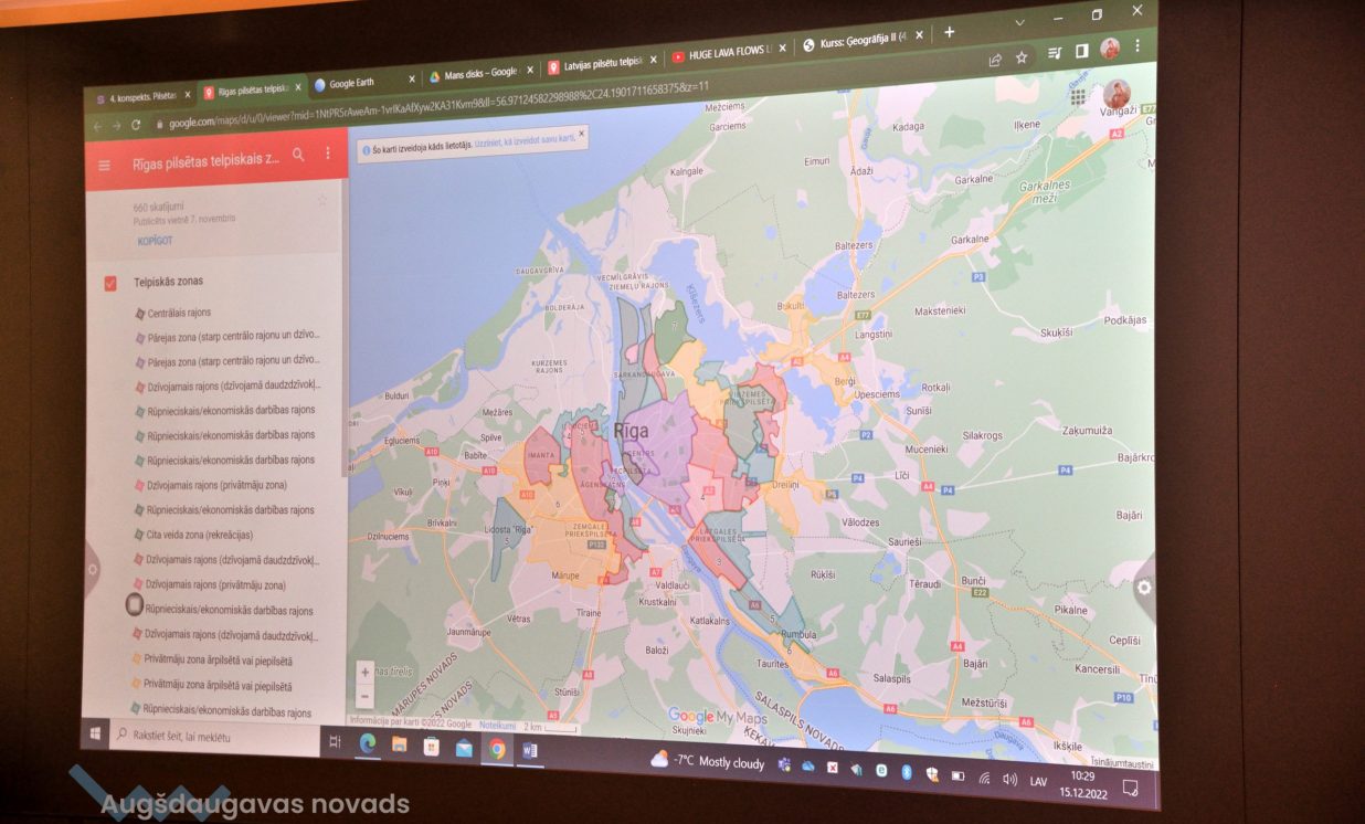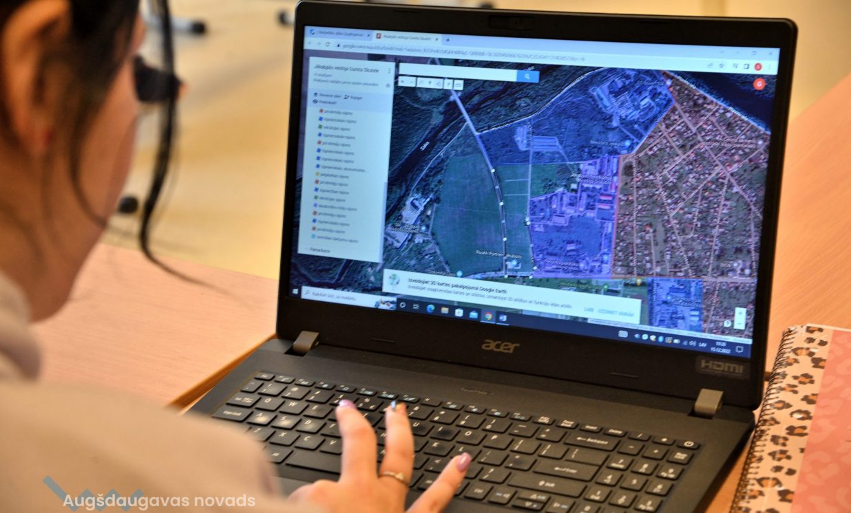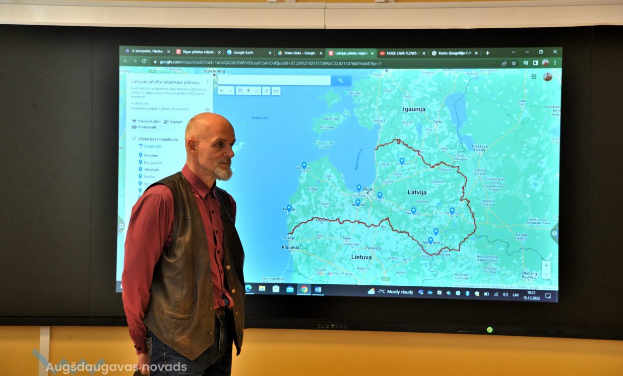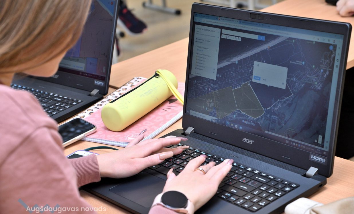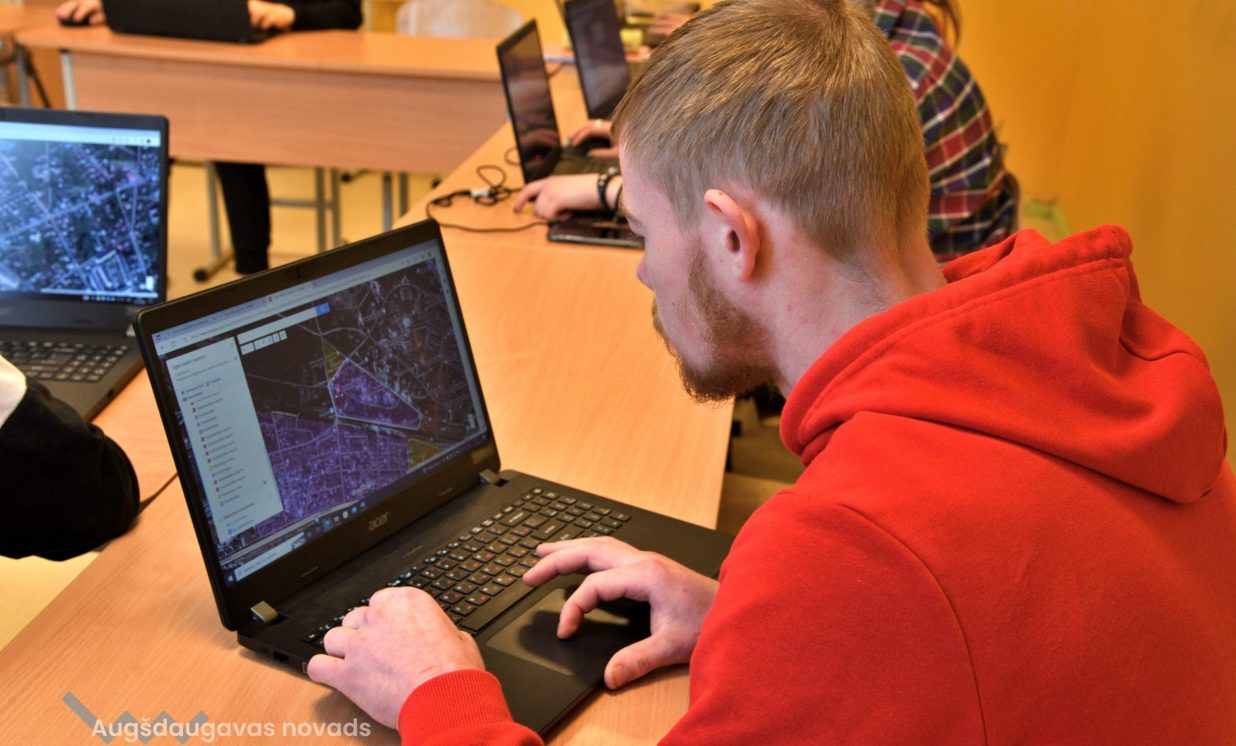 Konkrētajā mācību stundā jaunieši nodarbojās ar pilsētu telpisko zonējumu. Vienā no Latvijas pilsētām, viņiem bija jāveido karte ar sadalījumiem pēc apkaimju veidiem – darījumu rajons, dzīvojamais rajons, rūpnieciskais un citi. Bija jāveic arī ieteikumi, kā turpmāk attīstīt pilsētas teritorijas un to, kādas problēmas varētu būt šajā pilsētā. Darbojoties ar šādām kartēm tiek attīstītas modernās pilsētas vai novada plānošanas prasmes, un nākotnē jaunieši varēs izmantot savas spējas darba tirgū. Šāda veida speciālistus gaida gan pašvaldības, gan zemes dienests, gan statistikas iestādes. “Mēs mācāmies eksāmeniem, jo tajos iespējams arī būs jāveido digitālās kartes. Projektos darbi vairāk tiek uzdoti digitāli jeb internetā no dažādām mājaslapām. Datorā ir daudz vieglāk darboties nekā rakstīt ar roku. Internetā informācija ir labāk uztverama nekā pierakstos, jo paspēt visu uzrakstīt ir sarežģīti, lielā apjoma dēļ. Tā var labāk sekot līdzi skolotāja teiktajam, nevis domāt par pierakstiem,” teic 12. klases audzēkne Gunita. Jauniete arī piebilst,