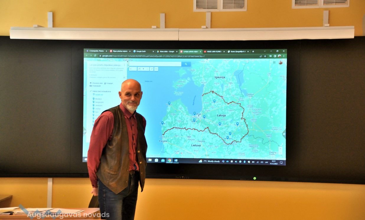 Ģeogrāfijas kabinetā ir pieejama jaunā interaktīvā tāfele, neliela meteostacija un personīgie datori katram skolēnam. Ģeogrāfijas priekšmetā tas ļauj izmantot digitālās karšu sistēmas. Stundā tiek strādāts ar ĢIS sistēmu un Google Maps, veidojot dažādas kartes. Jānis Suveizda, ģeogrāfijas, vēstures un bioloģijas skolotājs: “Ģeogrāfijas maize, tā ir karšu veidošana. Jaunieši apgūst, kā savu materiālu vai pētījumu papildināt ar paša veidotu karti. Arī apgūst, kā analizēt kartes un iegūt informāciju no tām. Tagad vairāk izmantojam digitālās kartes.”