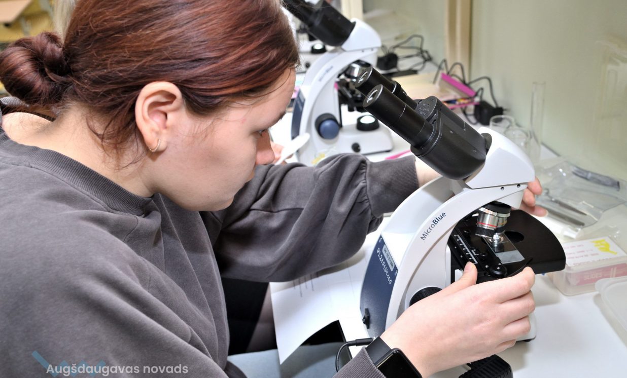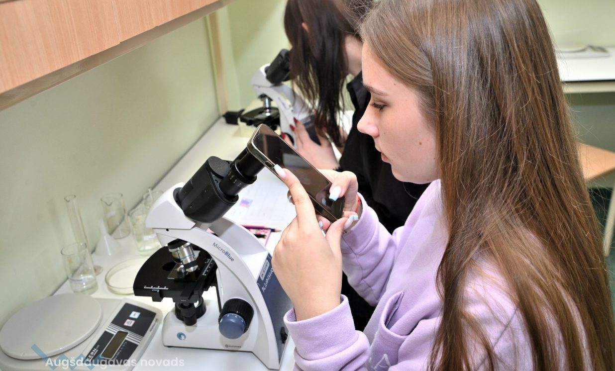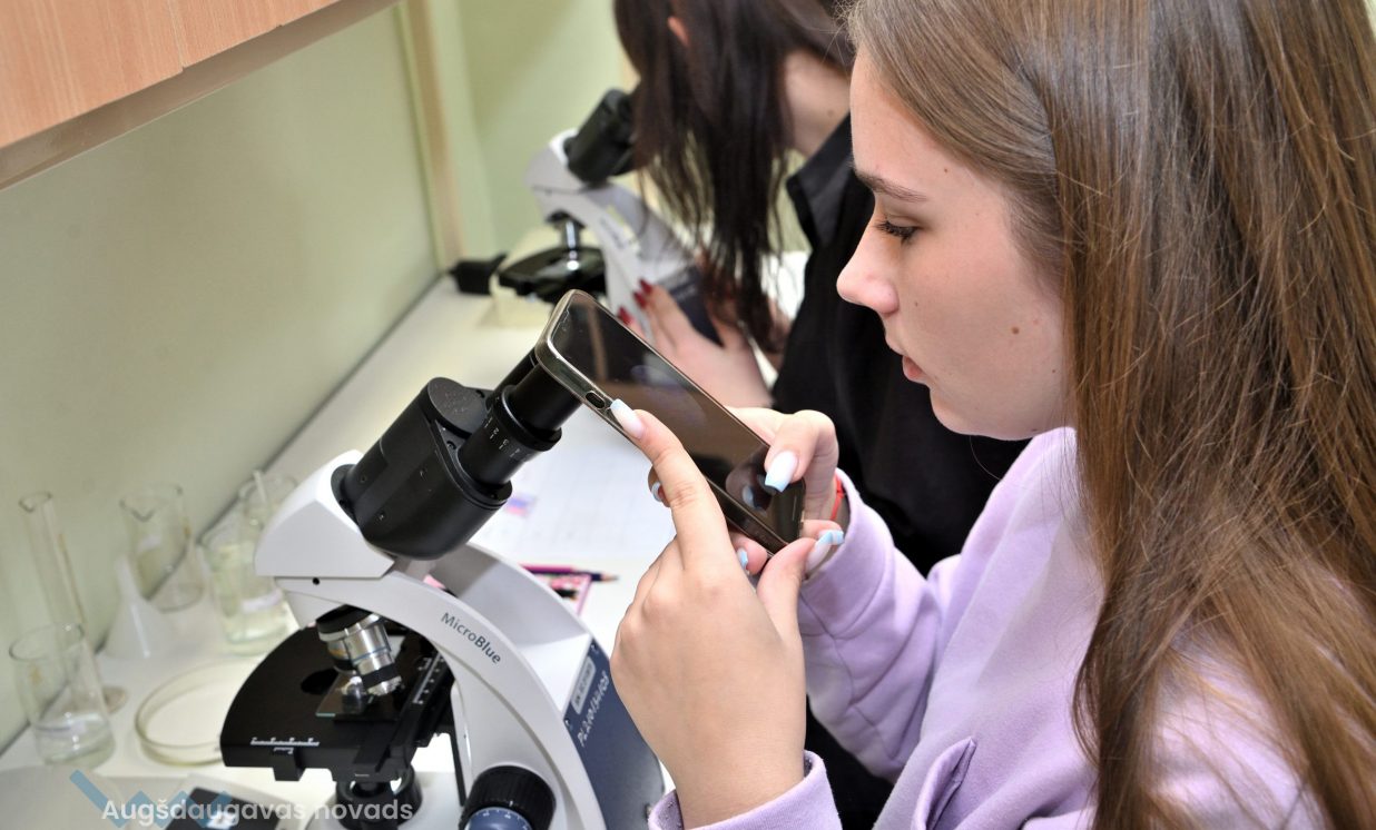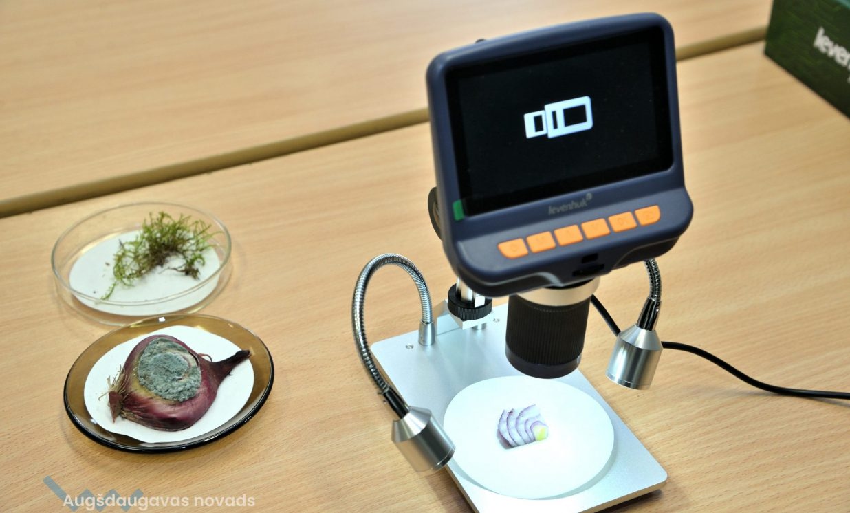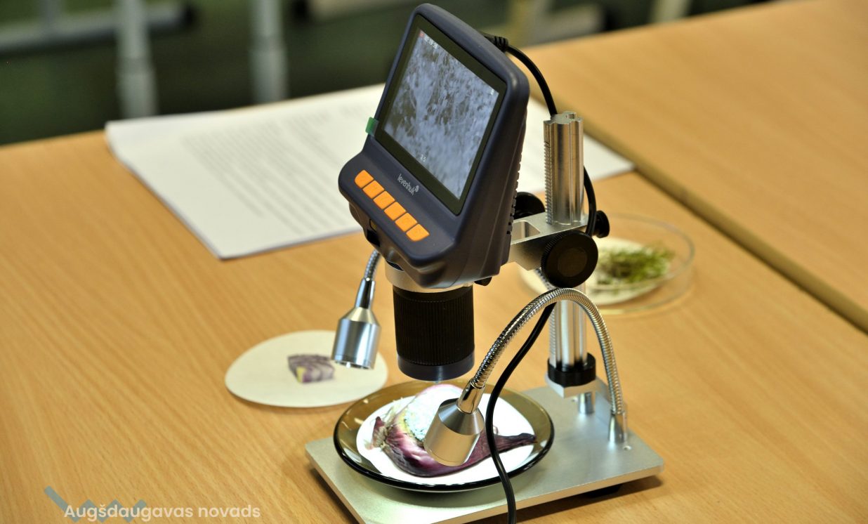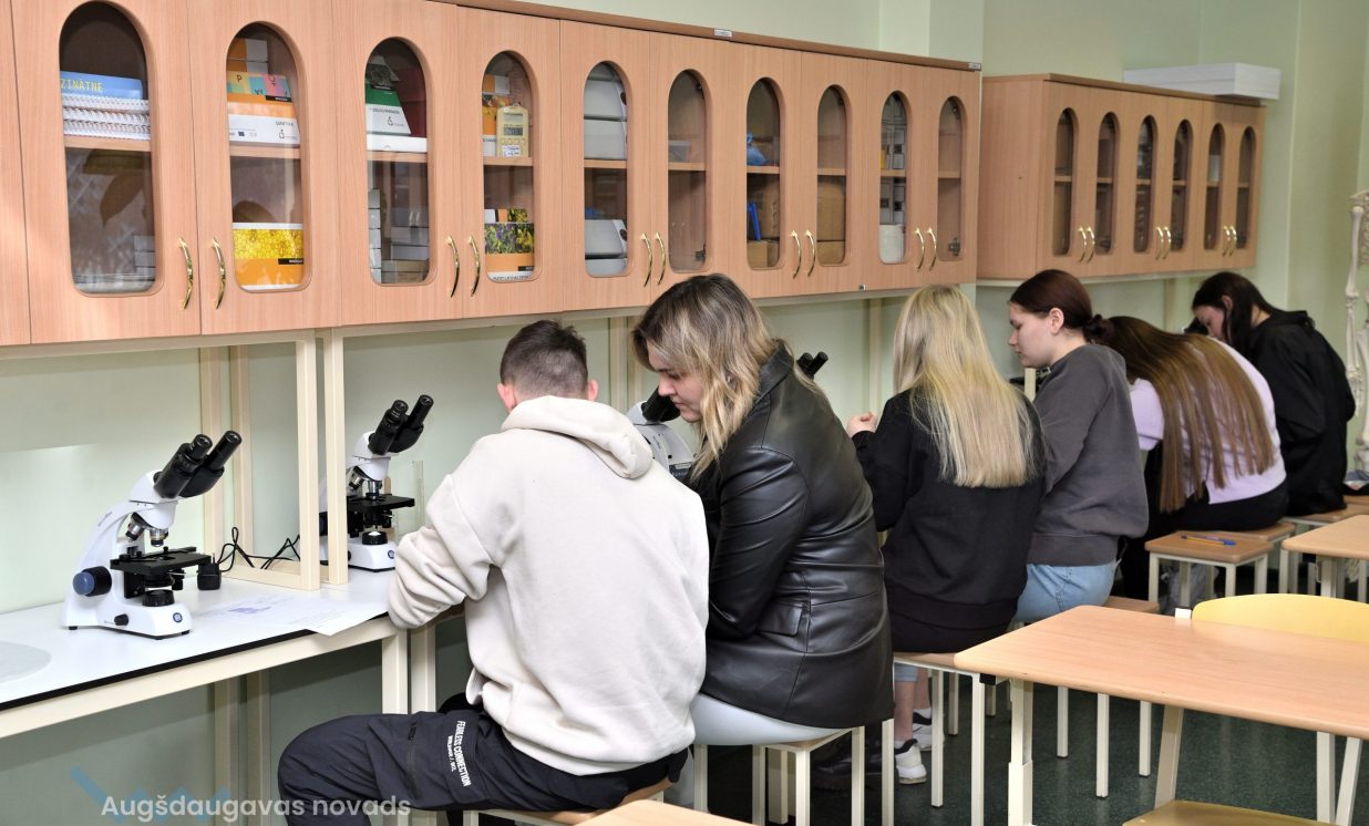 Arī bioloģija ir padziļināts priekšmets Špoģu vidusskolā, kas nozīmē, ka tas tiek apgūts daudz nopietnākā un sarežģītākā līmenī. Lai varētu īstenot šos mērķus, tika iegādāti mūsdienīgi gaismas mikroskopi. Šajos mikroskopos ir pieejamas dažādas jaunas funkcijas, tostarp pieci dažādi palielinājumi, kā arī ar diafragmu ir iespējams regulēt gaismas plūsmu. Skolēniem tas ļauj daudz nopietnāk sagatavoties turpmākajām studijām augstskolās. Kā skaidro bioloģijas skolotāja Anna Vasiļjeva, izmantojot pie tāfeles pieslēgto digitālo mikroskopu, kas objektu attēlo 3D formātā, ar izglītojamajiem iespējams apspriest ainu, kura redzama uz ekrāna.
