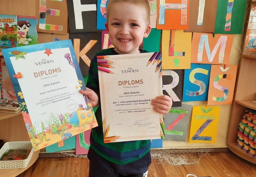 Publiskajā balsojumā kategorijā individuālais darbs 2 - 4 gadi 1. vietu ieguva Jānis Zukulis un 8. vietu ieguva Karolīna Kalēja! Kategorijā grupu darbs 2 – 4 gadi 1.vietu ieguva 3.gadīgo grupiņas “Bitītes” darbs “Lāsīte pie lāsītes”! Emīlija Vanaga no 6.gadīgo grupiņas ieguva pateicības rakstu no mākslinieciskās žūrijas par māksliniecisko izpildījumu. Tika izvēlētas balvas, kuras papildinās pirmsskolas sporta inventāru un mācībām nepieciešamos materiālus. Balvas tika sagaidītas ar lielām ovācijām un neviltotu prieku. Venden bija parūpējušies, lai dāvanu saņemšanas diena izvērstos par īstiem svētkiem. Par to mēs visi viņiem sakām neviltotu PALDIES!!! Vislielāko prieku un svētku sajūtu pirmsskolēni izbaudīja 31. maijā, kad visa pirmsskola skolas stadionā varēja pūst burbuļus, kurus uzdāvināja Venden. Bērniem bija milzīgs prieks, visi izmēģināja roku, pūšot burbuļus – gan lielus, gan mazus!