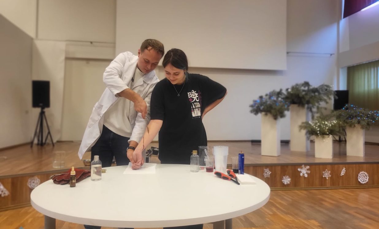 Nodarbības sākumā skolēni, diskutējot ar nodarbības vadītāju, mēģināja noskaidrot, kuru profesiju pārstāvjiem ir jāzina ne tikai māksla, bet arī ķīmija, bioloģija, matemātika un fizika. Nodarbībā skolēni uzzināja dažādus veidus, kā iegūt mākslīgo sniegu, mākslīgās asinis, kā arī iepazīstināti ar sprādzieniem, kas saistīti ar degšanu. Pēc nodarbības skolēni atzina, ka bija pārsteigti par to, cik vienkārši, dabīgi un mājās pieejami materiāli (medus, pārtikas krāsvielas, kartupeļu ciete, papīrs, glicerīns) tiek izmantoti mākslīgā sniega un mākslīgās asins radīšanā. Daudzi ieinteresētie jaunieši izjuta mākslīgā sniega efektu savās plaukstās un piedalījās asiņainu rētu veidošanas demonstrējumos. Īpaši aizraujoši skolēniem bija vērot eksperimentus ar uguni un sprādziena rašanos. Tas viss nebūtu īstenojams bez ļoti precīziem aprēķiniem un specifiskām zināšanām. Tā ir māksla un zinātne, ko speciālisti veic aizkulisēs, lai pēc iespējas precīzāk attēlotu filmā redzamos efektus.