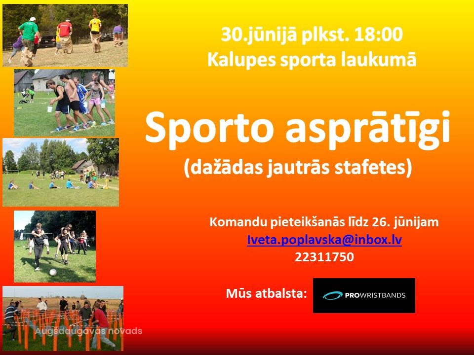 Kalupes pagasta jaunieši ielūdz uz pasākumu "Sporto asprātīgi", kura laikā varēs piedalīties dažādās jautrajās stafetēs. Pēc pasākuma būs Putu ballīte, kur jaunieši varēs ļauties dejām putu mākonī. Ieeja brīva. Līdzi jāņem labs garastāvoklis, lieks apģērba pāris, kā arī kaut kas uzkožams.