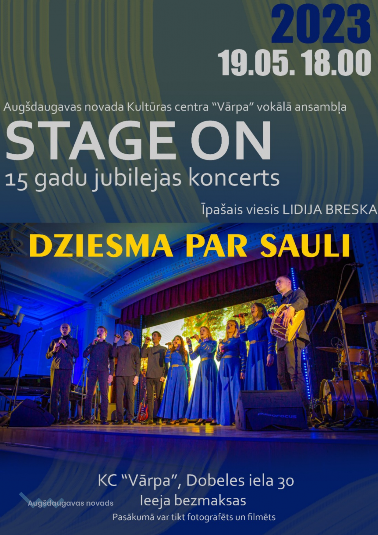 19.maijā plkst.18.00 „Stage On" visus laipni aicina uz vokālā ansambļa 15 gadu jubilejas koncertu “Dziesma par sauli” Kultūras centrā "Vārpa", Dobeles ielā 30.