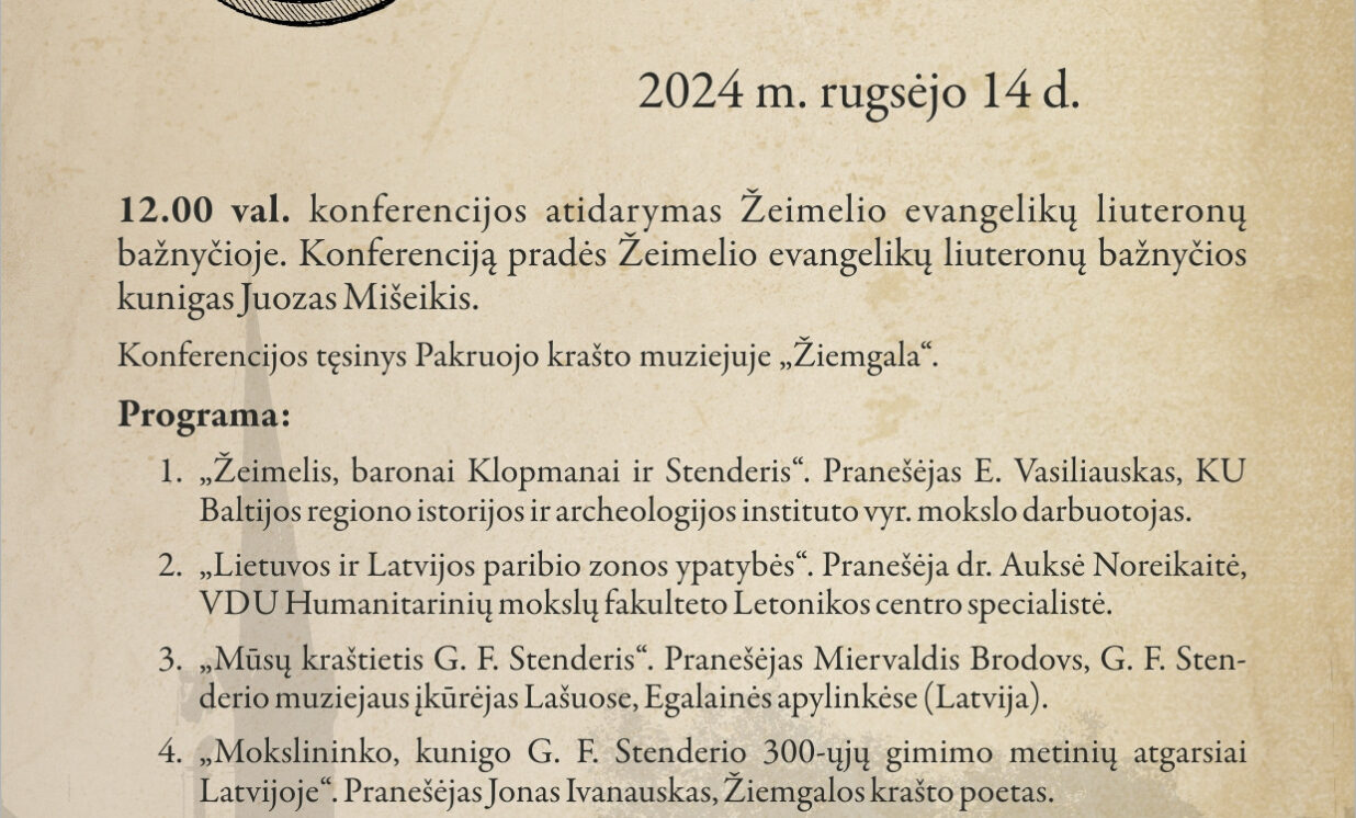 Eglaini un Žeimeles pilsētu Lietuvā saista viens uzvārds - Gothards Fridrihs Stenders. Mūsu novadnieks, kas piedzima un līdz 16 gadu vecumam nodzīvoja Lašu mācītājmājā. Un Žeimes luterāņu draudzes mācītājs Stenders, kas no 1753. līdz 1759. gadam kalpoja šajā draudzē. Varbūt tāpēc Stendera muzeju Eglainē un Žeimeles pilsētu Lietuvā saista nopietna sadarbība. Ir aprunāti nopietni sadarbības plāni, kas pakāpeniski tiek arī realizēti. Žeimes folkloras kolektīvs piedalījās Stendera svētkos Eglainē un guva klausītāju un skatītāju neviltotu atzinību. Nesen Stendera muzeja pārstāvji apmeklēja Žeimes pilsētu, lai piedalītos Zinātniskajā konferencē, kas veltīta G.F.Stendera 310.dzimšanas dienai. Konferences atklāšanā 1793. gadā celtajā Žeimes luterāņu baznīcā draudzes mācītājs Juozas Mišeikis savā svētbrīža uzrunā uzsvēra, ka jau vēsturiski ir veidojies, ka līdz 16. gadsimtam pilsētiņa bijusi Livonijas KonfederācijasKurzemes un Zemgales hercogistes sastāvā, tāpēc šeit joprojām saglabājušās stipras luterāņu baznīcas tradīcijas un latvieši kā mazākumtautība. Šķiet, ka Ziemeļlietuvā tautība, ticība un valoda nekad nav bijis šķērslis draudzīgai dzīvošanai. Kā savdabīgs muzikālais sveiciens konferences dalībniekiem izskanēja Bauskas folkloras kolektīva “Trejupe” skandētās tautas dziesmas. Konferences turpinājumā klausītāju piepildītajā vietējā muzeja zālē tika piedāvāta ļoti interesanta un daudzpusīga lasījumu tematika gan par Latvijas - Lietuvas pierobežas īpatnībām šodien (Aukse Noreikite, Viļņas universitātes Letonikas centra speciāliste), gan par vēsturiskajām tēmām -Klopmaņu dzimta, Stenders un Žeime (Ernestas Vasiliausks, Klaipēdas Universitātes Baltijas reģiona vēstures un arheoloģijas instituts). Savdabīgu atskatu uz Stendera 300 svinību norisi Sūnākstē pirms 10 gadiem sniedza dzejnieks Jonas Ivanauskas. Mūsu stāstījums par Stenderu kā mūsu novadnieku, izraisīja īpašu uzmanību, jo daudzi fakti, ko mēs sniedzām, lietuviešu klausītājiem bija jaunums. Aizkustinošs bija vecās mācītājmuižas apmeklējums. Simtgadīgajā mājā ar vietējā entuziasta Juoza Grigaļūnasa darbīgajām rokām ir atklāts Vecās tehnikas muzejs un šobrīd šajā muzejā ir atklāta Stendera piemiņas istaba. Varbūt ne tāda, kādu mēs esam pieraduši redzēt. Ar īstajiem vecās muižas sirmajiem baļķiem. Ar veļasmašīnu meistara interpretācijā... Ar eksponātu aplūkošanu īstās petrolejas lampas gaismā... Un patiesu cieņu pret Gothardu Fridrihu Stenderu. Taču vērts atcerēties, ka Stendera grāmatās, kurās mēs šodien ieskatāmies un citējām nav jāmeklē izcilas mākslinieciskas vērtības. Mūsdienu cilvēkus saista šo mazo grāmatiņu kultūrvēsturiskā nozīme. Stendera stāstījuma sirsnīgā naivitāte un tai pašā laikā lielā nopietnība palīdz skaidrāk izjust šos kontrastus, kas šķir mūs no 18 gadsimta un tā šķietami rāmā laika tecējuma. Jo ir vērtīgi pagātni neaizmirst, pagātne ir jāpatur prātā, no tās ir jāmācās, jo tikai skatoties atpakaļ mēs varam būvēt jēdzīgu un cerīgu nākotni. Mūsu nākošais sadarbības projekts ir Maļinovas pagasta bibliotēkas izšūto dvieļu kolekcijas eksponēšana šajā Lietuvas pilsētā. Tie, kas vēl nav paspējuši šo kolekciju aplūkot un novērtēt, to līdz sezonas beigām var izdarīt Stendera muzejā Eglainē.