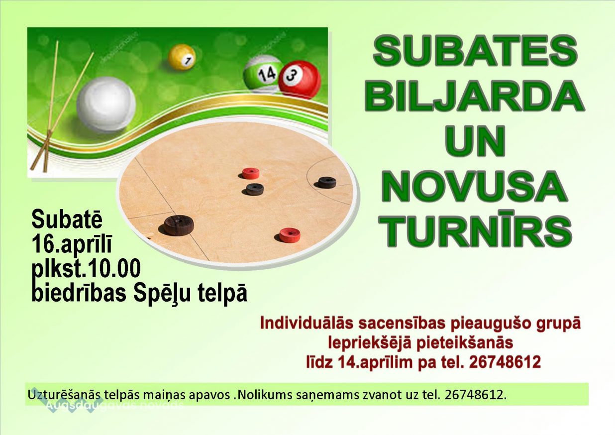 16. aprīlī plkst. 10.00, Subatē, biedrības Spēļu telpā norisināsies biljarda un novusa turnīrs (individuālās sacensības pieaugušo grupā).
