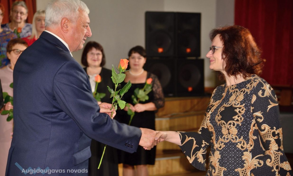 Augšdaugavas novada pašvaldības domes priekšsēdētājs Arvīds Kucins, sveicot skolotājus, uzsvēra, ka skolotāji, bērni, vecāki un pašvaldība ir viena liela ģimene. Ja skolotāji jūtas labi, tad labi jūtas arī pārējie. “Pateicoties jums, bērni kaut ko sasniedz dzīvē, un jūs pēc tam lepojaties, ka tas ir jūsu skolnieks, kas izgājis lielajā dzīvē, daudz sasniedzis, bet jūs esat atraduši viņam pieeju ar savu entuziasmu un zināšanām, esat pieslīpējuši šo briljantiņu tos gadus, kamēr viņš bijis jūsu redzeslokā. Paldies par jūsu darbu, lai ir laba veselība, prieks atnākt uz darbu un lai mājās jūs gaida,” vēlēja pašvaldības vadītājs.