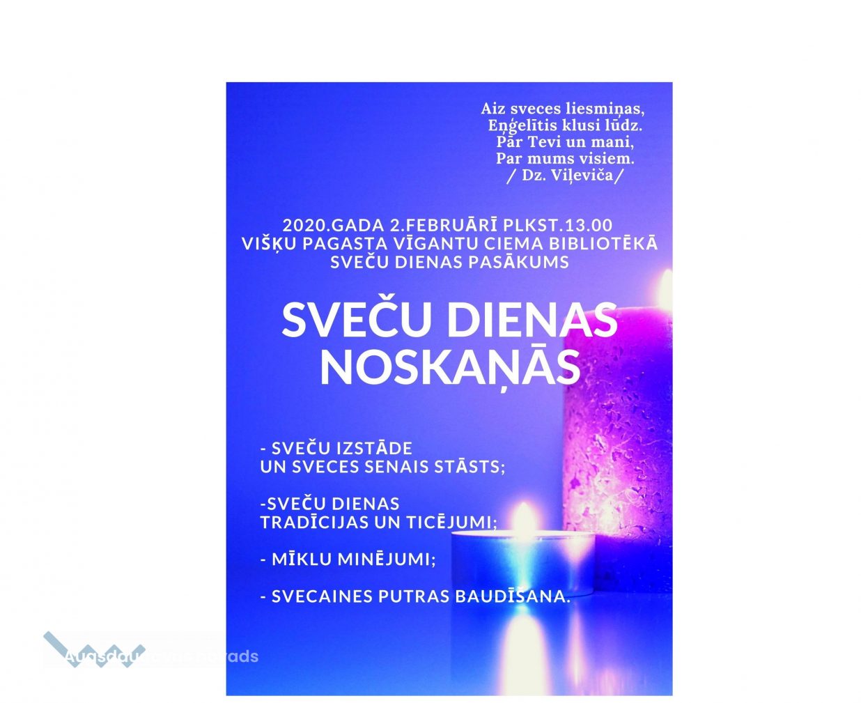 2020. gada 2. februārī, plkst. 13.00, Višķu pagasta Vīgantu ciema bibliotēkā norisināsies SVEČU DIENAS pasākums "SVEČU DIENAS NOSKAŅĀS":