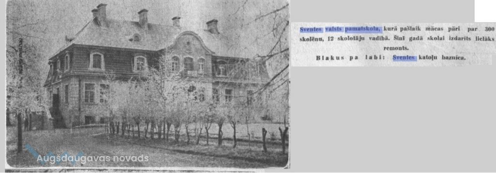 ”Kulturāli – sabiedriskā laukā rosīgi darbojas Sventes valsts 6-kl. pamatskola, kuŗu šogad apmeklē 320 skolēni. Skolā strādā 12 skolotāji. Skolēniem izsniedz siltas pusdienas; tiem audzēkņiem, kas paliek internātā, vakaros un rītos arī tēju. Skolā ir mazpulks, skautu vienība, Cerības pulciņš, aviācijas pionieru pulciņš un skolēnu kooperatīvs „Palīgs”. Pie skolas pastāv lasāmgalds un noorganizēta papildskola vakara kursu veidā, šogad papildskolu apmeklē 57 klausītāji.”