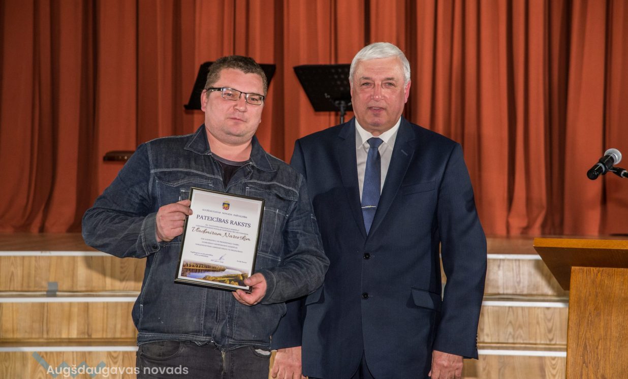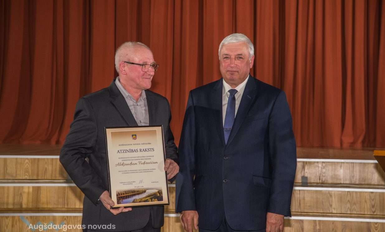 ◀ Augšdaugavas novada pašvaldības centrālas administrācijas saimniecības pārzinis Aleksandrs Fedorovičs par ilggadēju un priekšzīmīgu amata pienākumu pildīšanu un prasmīgu saimnieciskā darba nodrošināšanu.