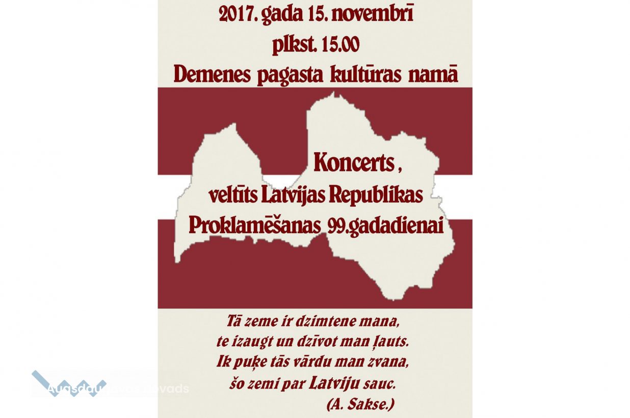 15. novembrī plkst. 15.00 Demenes Kultūras namā notiks koncerts, veltīts Latvijas Republikas Proklamēšanas 99. gadadienai.