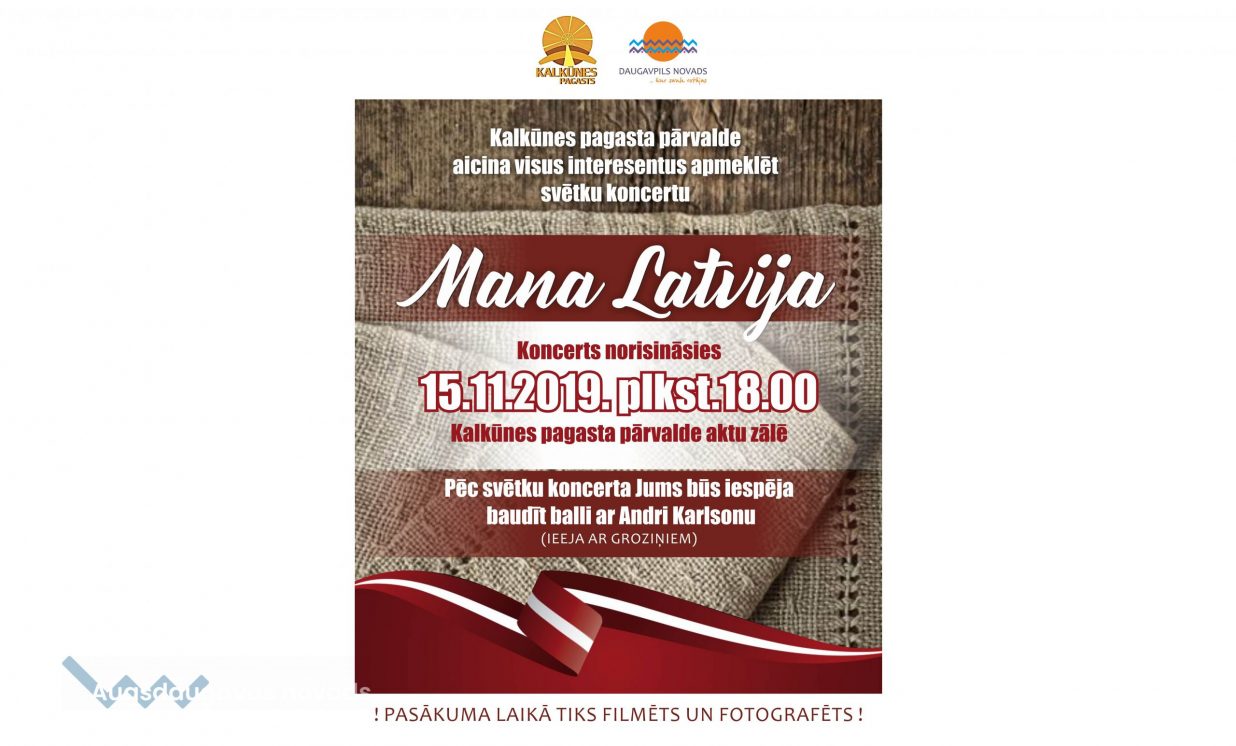 Kalkūnes pagasta pārvalde aicina visus uz svētku koncertu "Mana Latvija", kas notiks 15.novembrī plkst. 18:00 Kalkūnes pagasta pārvaldes aktu zālē.