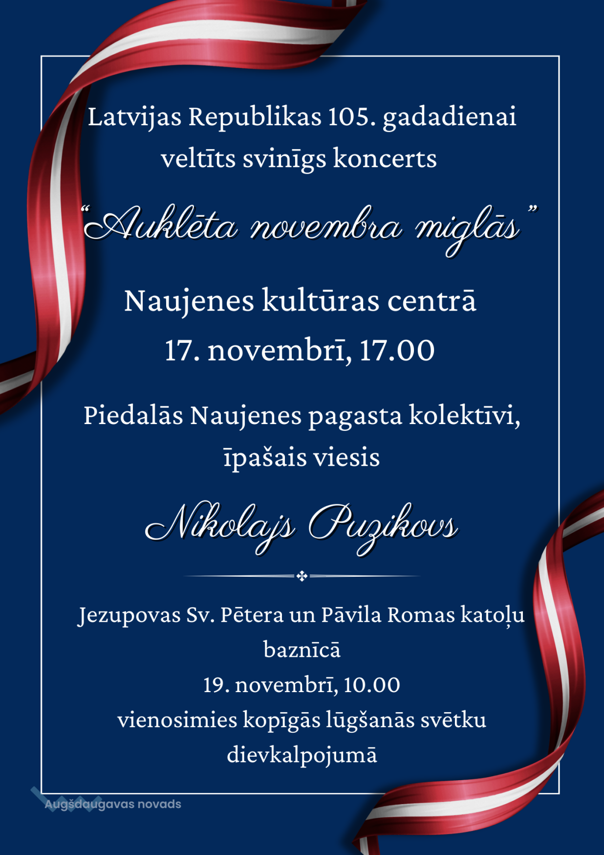 Svētku priekšvakarā, 17. novembrī aicinām apmeklēt Naujenes kultūras centru (Muzeja iela 6, Lociki), kur plkst. 17.00 notiks svinīgs koncerts “Auklēta novembra miglās”. Koncertā piedalīsies Naujenes pagasta radošie kolektīvi. Koncerta īpašais viesis – dziedošais policists Nikolajs Puzikovs. Kultūras centra foajē varēs apskatīt Naujenes Novadpētniecības muzeja izstādi par Naujenes pagasta Stropu, Vecstropu un Kraujas ciema vēsturi.
