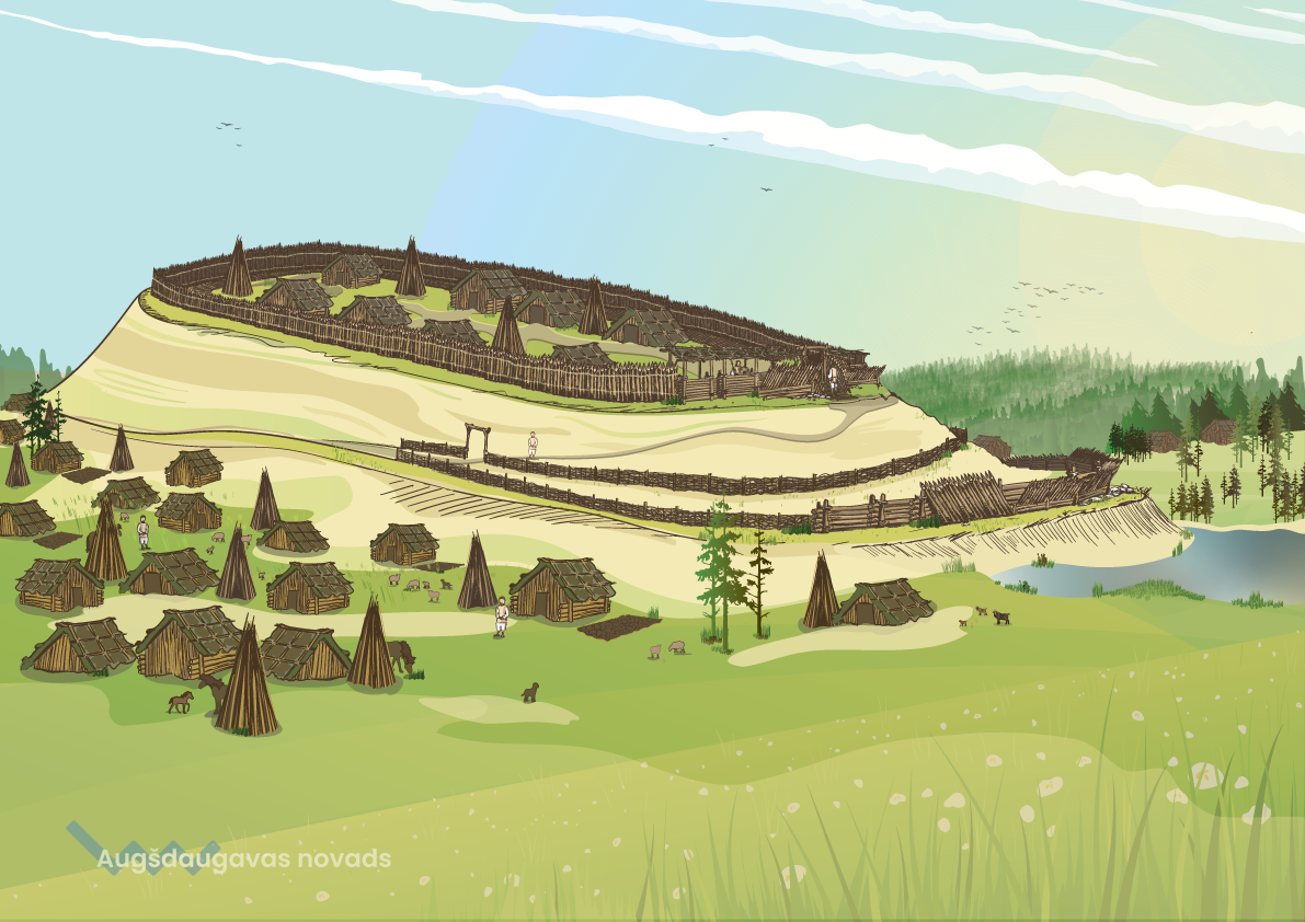 Pēc tam katru smalkā zīmējuma līniju vektorformātā pārnesa grafikas dizaineris Māris Strautmalis. Lai būtu pavisam droša par attēla mākslinieciskās interpretācijas atbilstību agrajam dzelzs laikmetam un pieejamiem pētījumiem, J.Bāra konsultējās arī ar arheologu, vēstures zinātņu doktoru Juri Urtānu, kurš veicis un publicējis plašu pētījumu klāstu arī par Augšzemes pilskalniem. Tapa vēl daudz precizējumu un interesantu papildinājumu, ko Māris Strautmalis arī veiksmīgi integrēja sākotnējā vektorattēla versijā. Pašlaik attēlā redzami nocietinājumi, ēkas un slieteņi, žogi, cilvēki, arī mājdzīvnieki – zirgi, suņi, aitas un kazas.