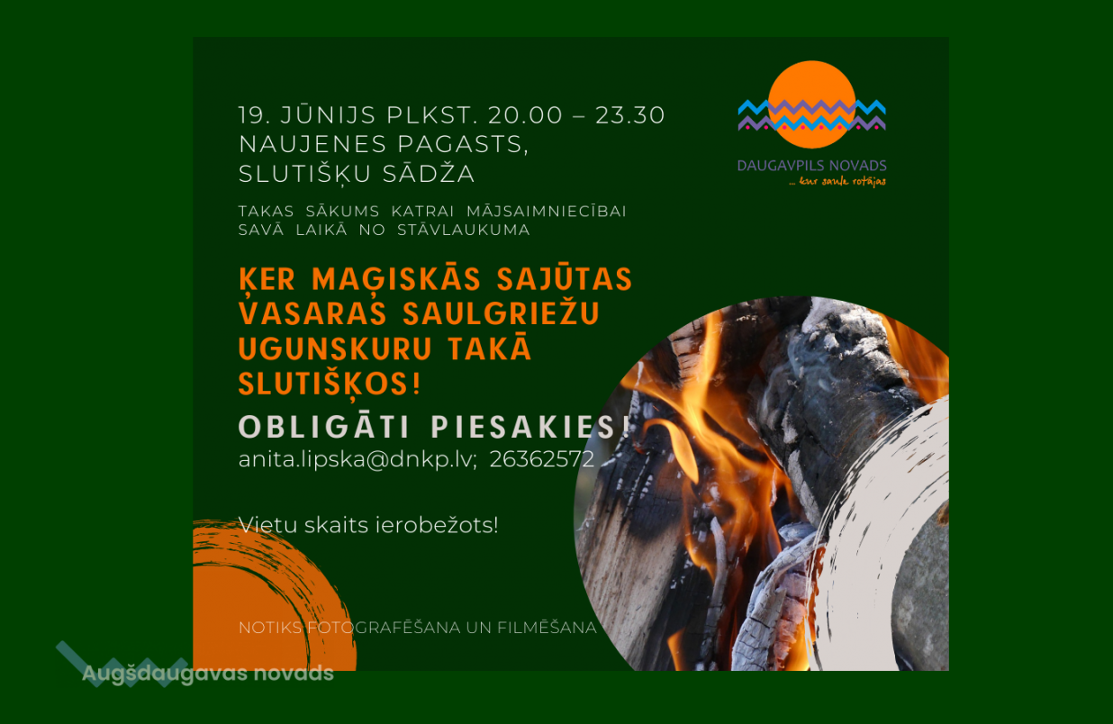 Sestdien, 19. jūnijā, laikā no plkst. 20.00 līdz 23.30 tiek piedāvāta iespēja doties uz Daugavpils novada Naujenes pagasta Slutišķu sādžu un ķert maģiskās sajūtas Vasaras saulgriežu ugunskuru takā Daugavas tuvumā.