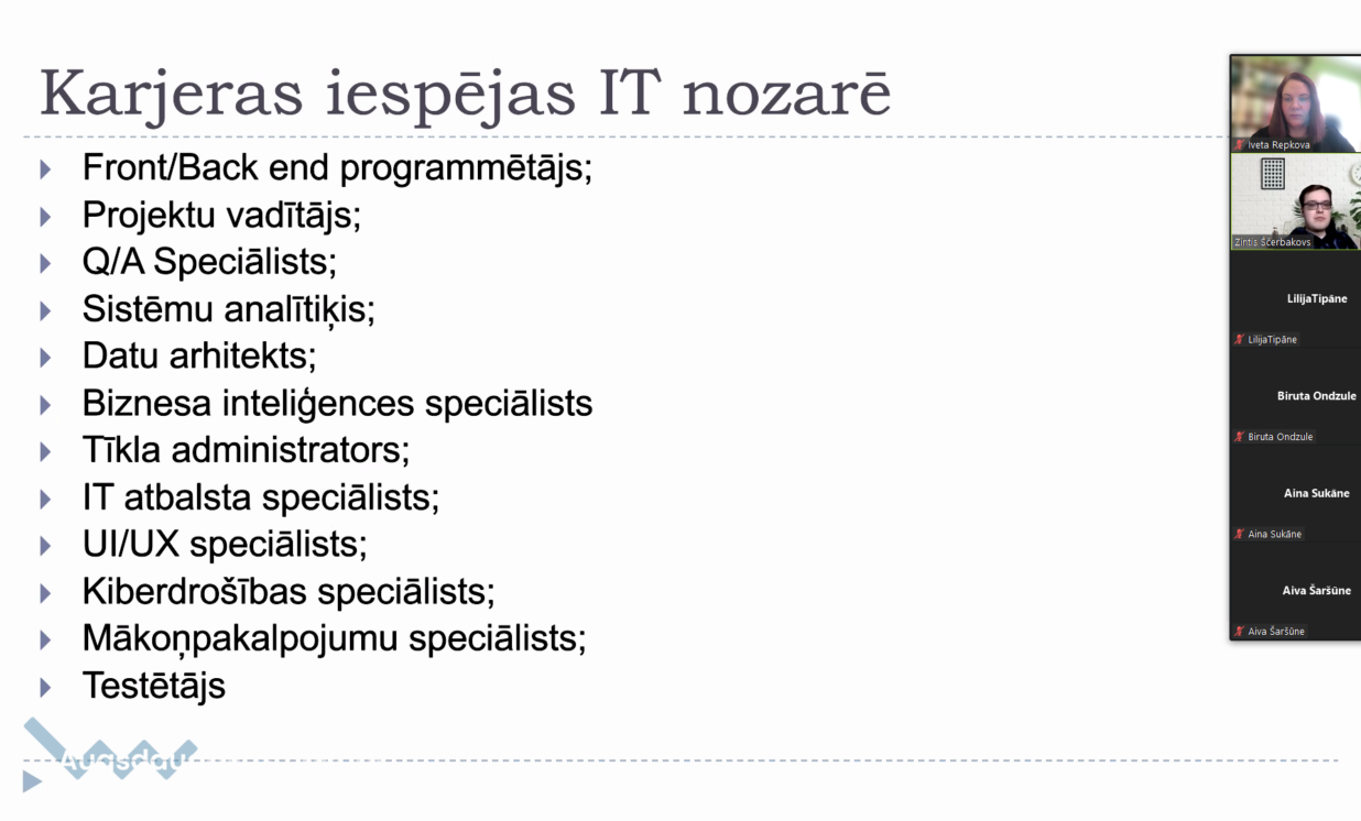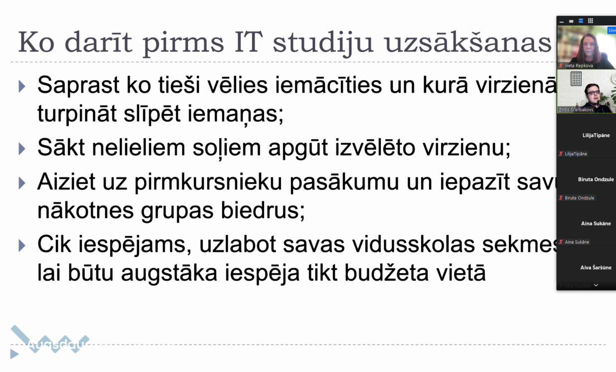 Jaunieši tiešsaistē tikās arī ar absolventiem, kuri jau ir ieguvuši kvalifikāciju un uzsākuši savas darba gaitas. Ar savu karjeras ceļu dalījās juriste Alīna, ārste – anestezioloģe, reanimatoloģe - Veronika, IT speciālists Zintis, treneris Mārtiņš un stjuarte Kristiāna. Absolventi pastāstīja par savām studiju gaitām, par absolvēto izglītības iestādi un iegūto kvalifikāciju, par to, kas pamudināja izvēlēties konkrēto profesionālo nozari un ar kādiem izaicinājumiem bija jāsastopas. Absolventi deva noderīgus padomus jauniešiem, kuri plāno studēt konkrētajā nozarē, pastāstīja par pirmo prakses pieredzi, par iespaidiem, par izaicinājumiem, piedzīvojumiem. Katrs absolvents iepazīstināja ar saviem galvenajiem darba pienākumiem, darba vidi, darba laiku un darba iespējām. Gandrīz visi absolventi minēja, ka galvenās īpašības, ko jāattīsta jau skolas laikā, ir vēlme mācīties, atbildība, uzmanība, pacietība, komunikācija, problēmsituāciju risināšana, līderība, un kā galveno visi atzīmēja – laika plānošanu.