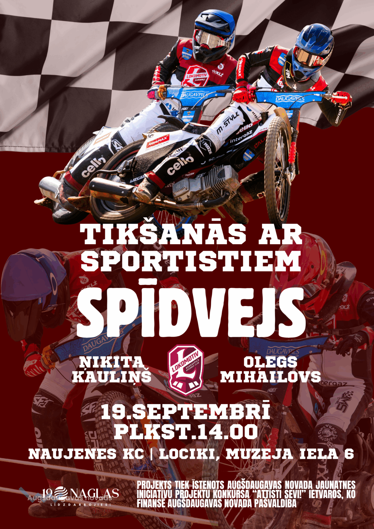 19. septembrī plkst. 14.00 Naujenes kultūras centrā (Lociķos, Muzeja ielā 6) notiks aizraujoša tikšanās ar Daugavpils spīdveja komandas “Lokomotīve” sportistiem Nikitu Kauliņu un Oļegu Mihailovu.
