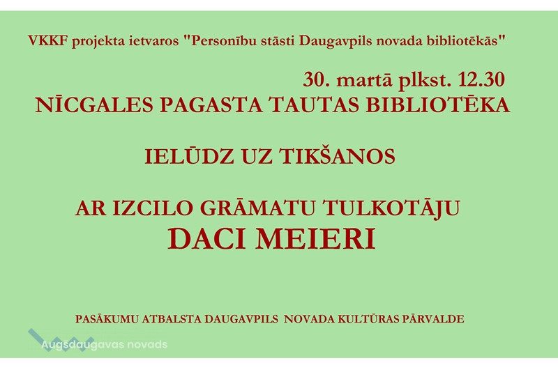 Tikšanās ar tulkotāju Daci Meieri Nīcgalē27.03.2017Kultūra 30. martā plkst. 12.30 Nīcgales pagasta tautas bibliotēkā VKKF projekta ietvaros "Personību stāsti Daugavpils novada bibliotēkās" notiks tikšanās ar izcilo grāmatu tulkotāju Daci Meieri. Pasākumu atbalsta Daugavpils novada kultūras pārvalde.