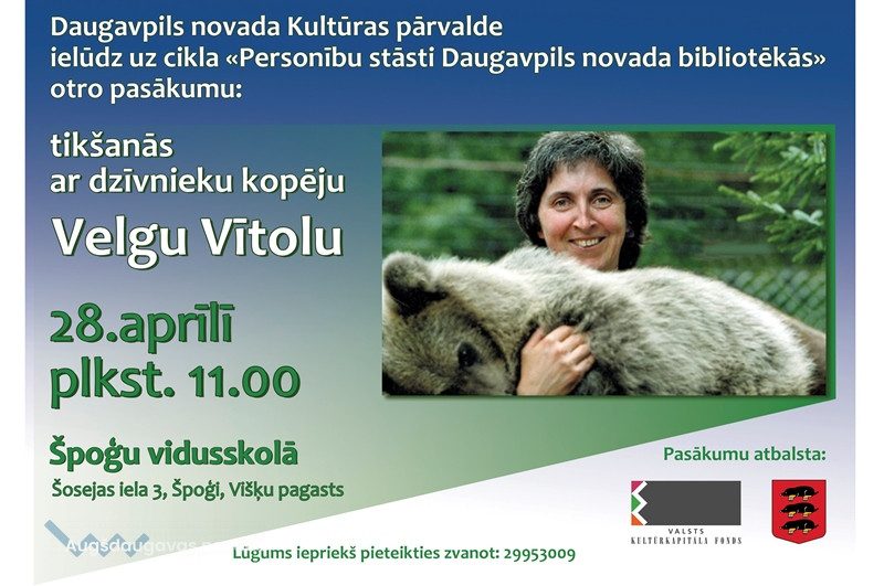 28.aprīlī plkst. 11:00 Špoģu vidusskolā Daugavpils novada Kultūras pārvalde ielūdz uz cikla “Personības stāsti Daugavpils novada bibliotēkās” otro pasākumu: tikšanās ar dzīvnieku kopēju Velgu Vītolu. Lūgums iepriekš pieteikties, zvanot 29953009.