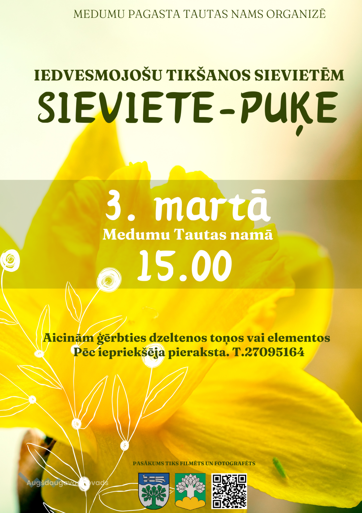 3. martā plkst. 15.00 (aptuveni 2 stundas) aicinām sievietes uz iedvesmojošu tikšanos “Sieviete - puķe.” Kopā ar šīs tikšanās nesēju, iesaistoties dažādās praksēs, meklēsim sevī harmoniju, sievišķību un iekšēju mieru. Aicinām ģērbties dzeltenos toņos vai elementos.