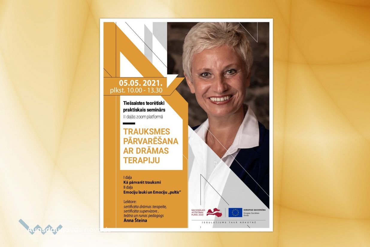 5. maijā plkst. 10.00 notiks tiešsaistes teorētiski praktiskais seminārs "Trauksmes pārvarēšana ar drāmas terapiju" divās daļās zoom platformā. To vadīs sertificēta drāmas terapeite, sertificēta supervizore, teātra un runas pedagoģe Anna Šteina.