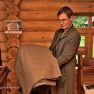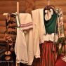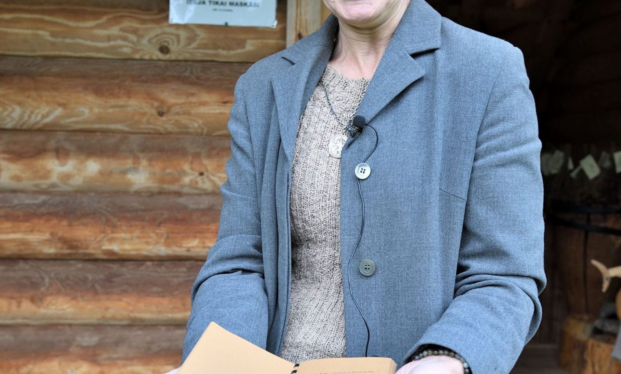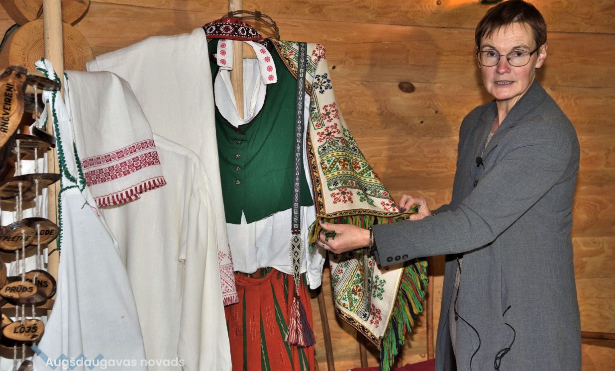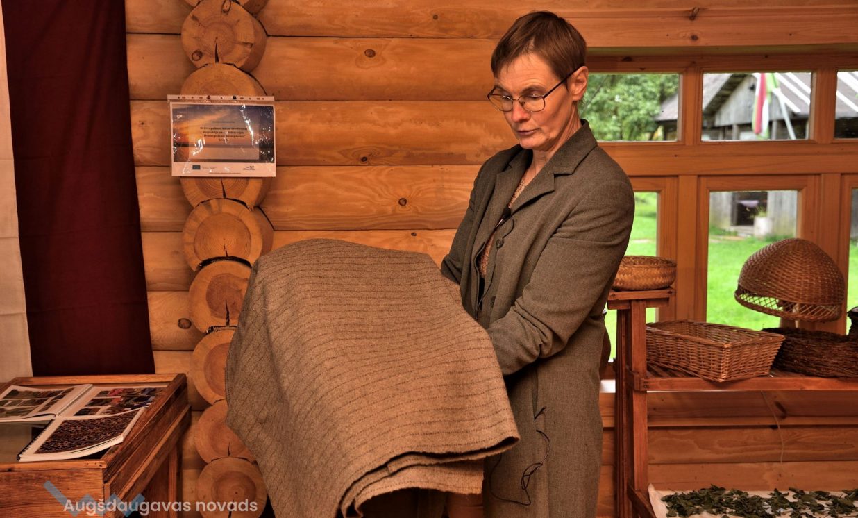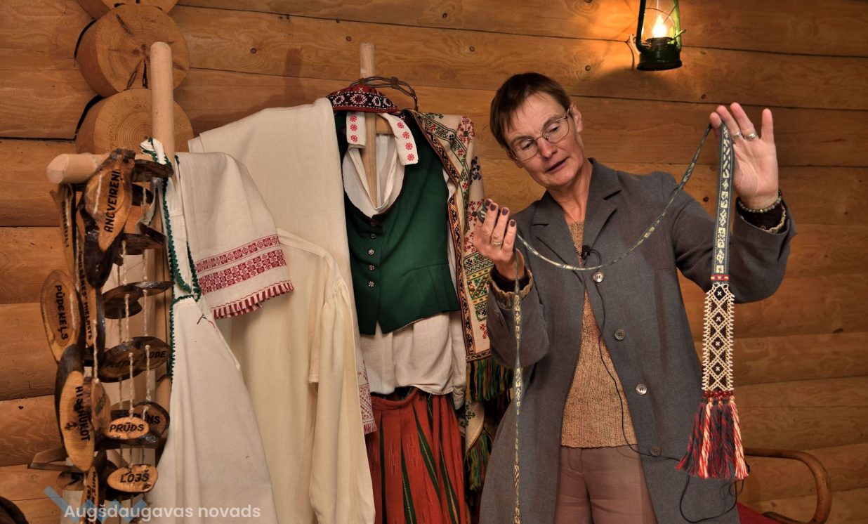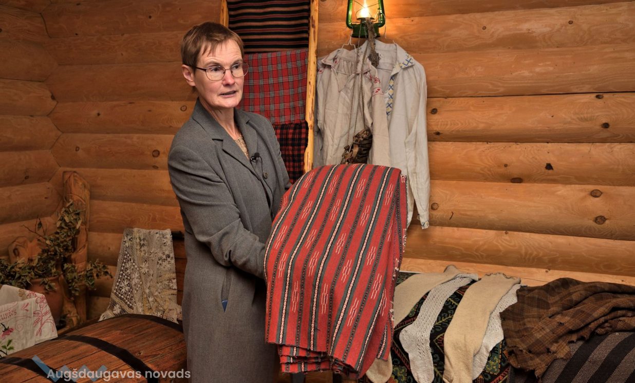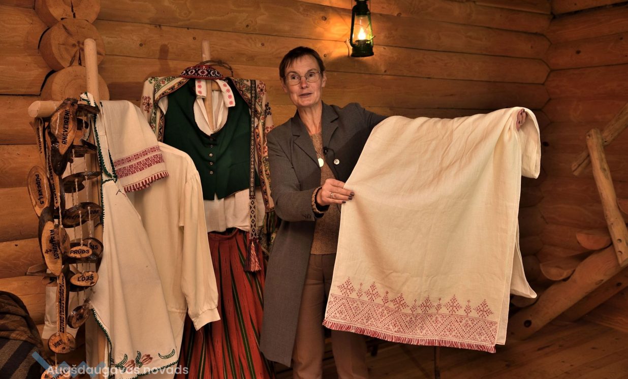 “Šis brunča audums ar lāsumiņiem, tiem gaišajiem ielaidumiem ir dārgākais Latvijā, jo te ir jāiegulda vislielākais laiks, lai tiktu pie tāda brunča. Rūtainos, svītrainos uzmetam stellē un aužam, bet lai tiktu pie lāsumiņa, katru lāsumiņu jāielasa iekšā,” stāsta Bebrenes pagasta priekšsēdētāja Benita Štrausa.