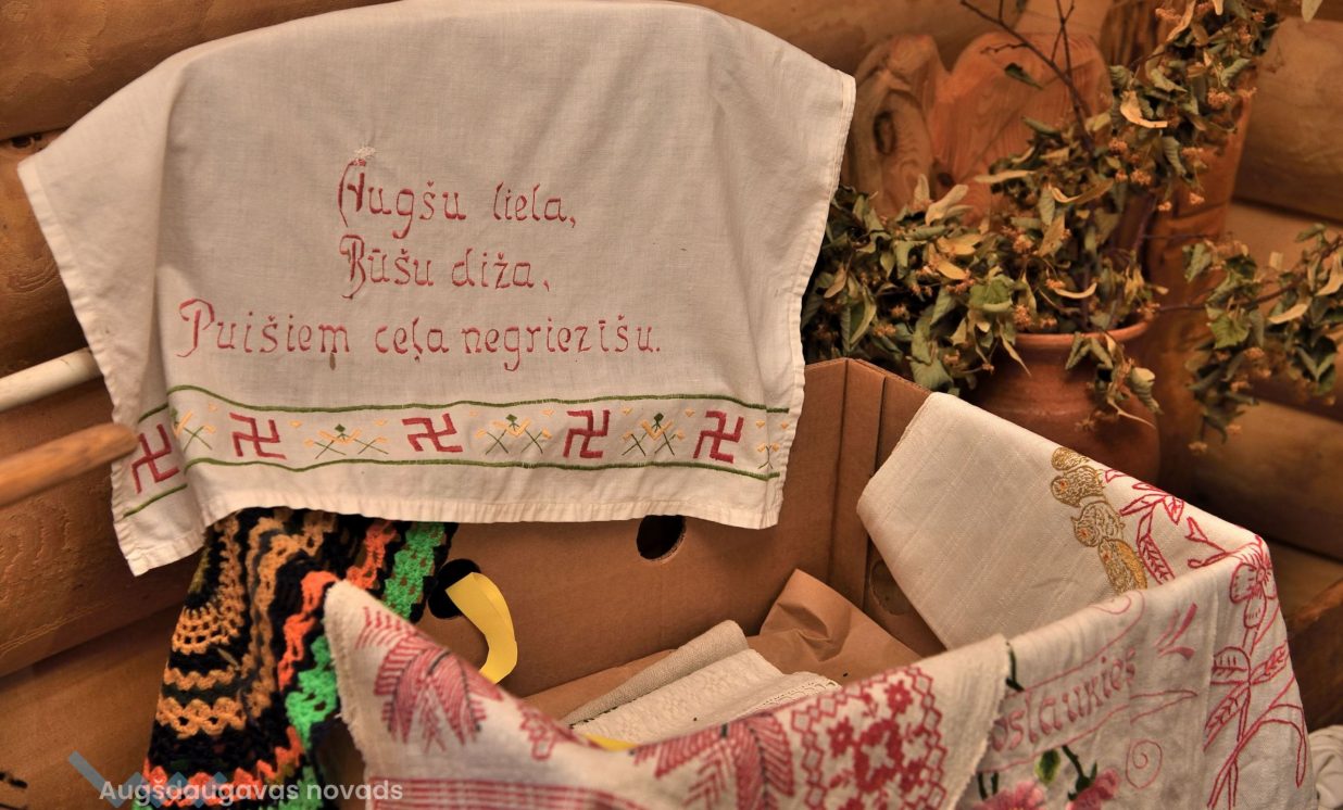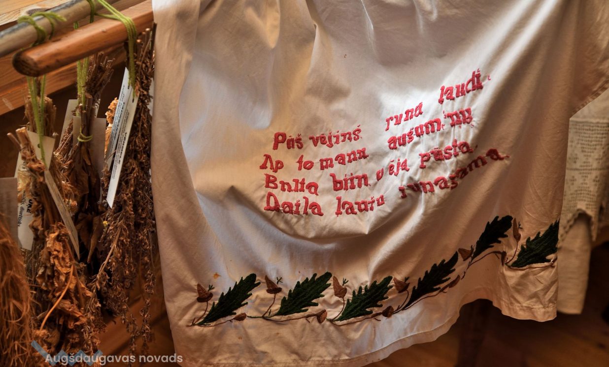 Turpina B. Štrausa: “Tad kad šo uzliek galvā, speciālajā sējumā, galva mēdz skaisti atliekties uz atpakaļu, zods un deguns paceļas, un Augšzemes saimniece var lepni doties uzņemt savus viesus.”