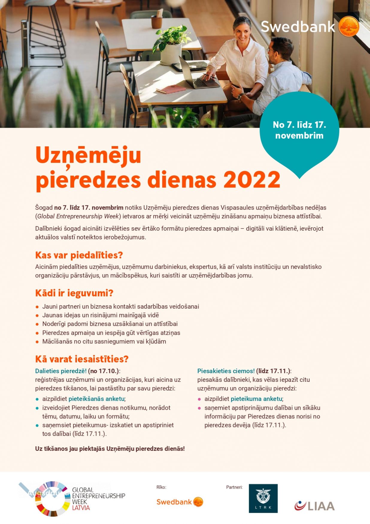 Iniciatīvu rīko Swedbank sadarbībā ar Latvijas Tirdzniecības un rūpniecības kameru (LTRK) un Latvijas Investīciju un attīstības aģentūru (LIAA) Pasaules uzņēmējdarbības nedēļas (Global Entrepreneurship Week) ietvaros.