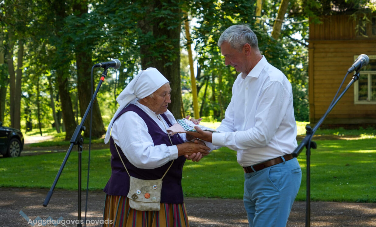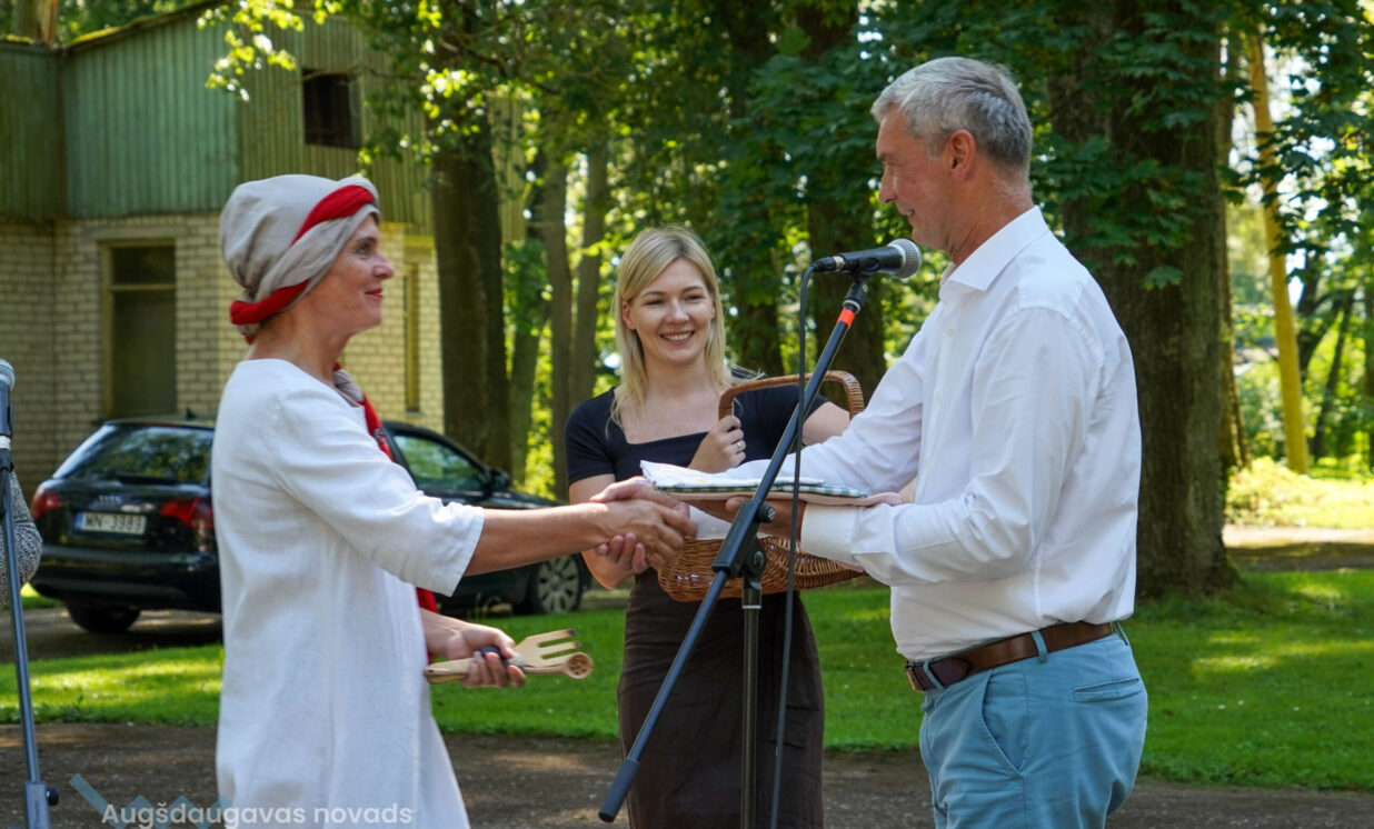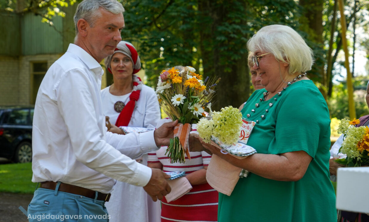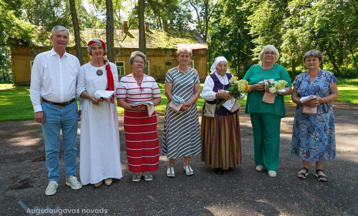 Skaistu dāvanu bija sagādājis ansamblis “Vabalis” – Daces Teivānes austus paklājiņus, ko dāvināja saviem draugiem – ansamblim “Stiprās sievas”.