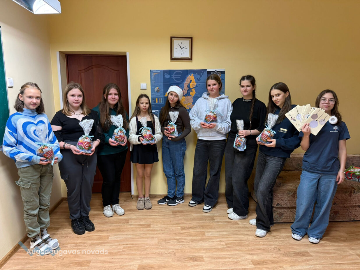 Šai vizītei meitenes bija rūpīgi gatavojušās – katra bija sagatavojusi pašceptu gardumiņu un apsveikuma kartīti ar sirsnīgiem Ziemassvētku novēlējumiem. Šie nelielie, bet no sirds dāvinātie pārsteigumi sagādāja skolotājiem īpašu prieku.