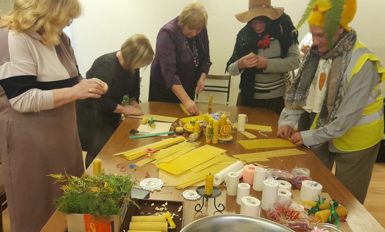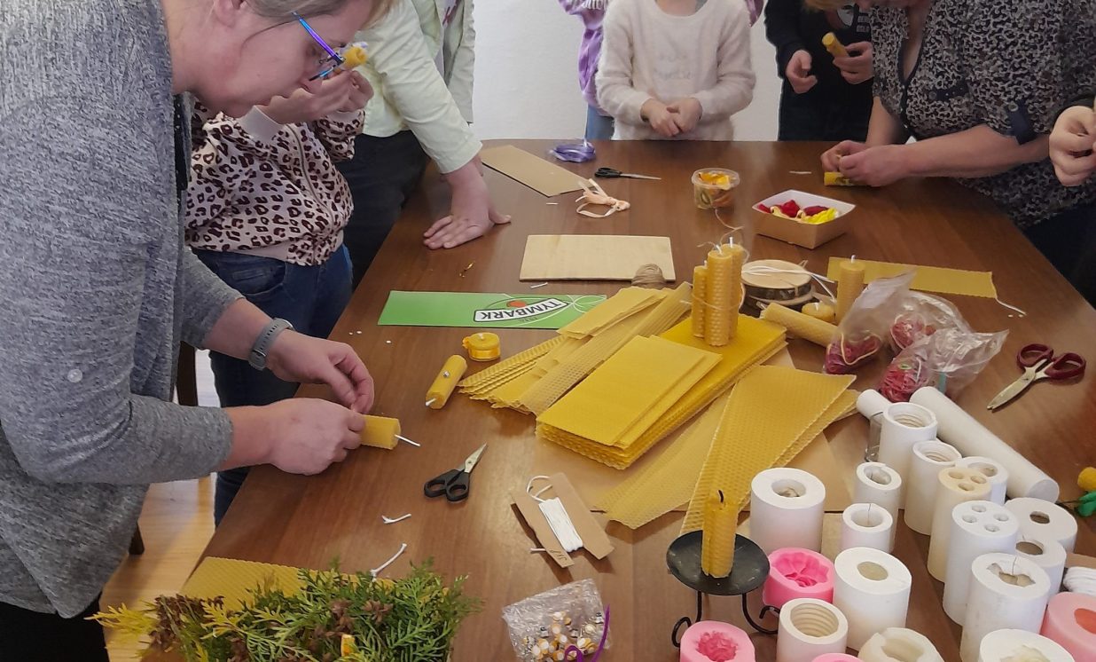 Blakus telpā bija iekārtota sveču liešanas darbnīca, ko vadīja Anna un Inese Melnes. Pasākuma dalībniekiem bija iespēja pašiem izliet un noformēt dabiskās vaska sveces. Sveču liešanas radošā aktivitāte kalupiešiem bija jauns kopā būšanas un laika pavadīšanas brīdis. Katrs mājas devās ar paštaisītu vaska svecīti. Paldies darbnīcas vadītājām Annai un Inesei par atbalstu pasākuma organizēšanā!