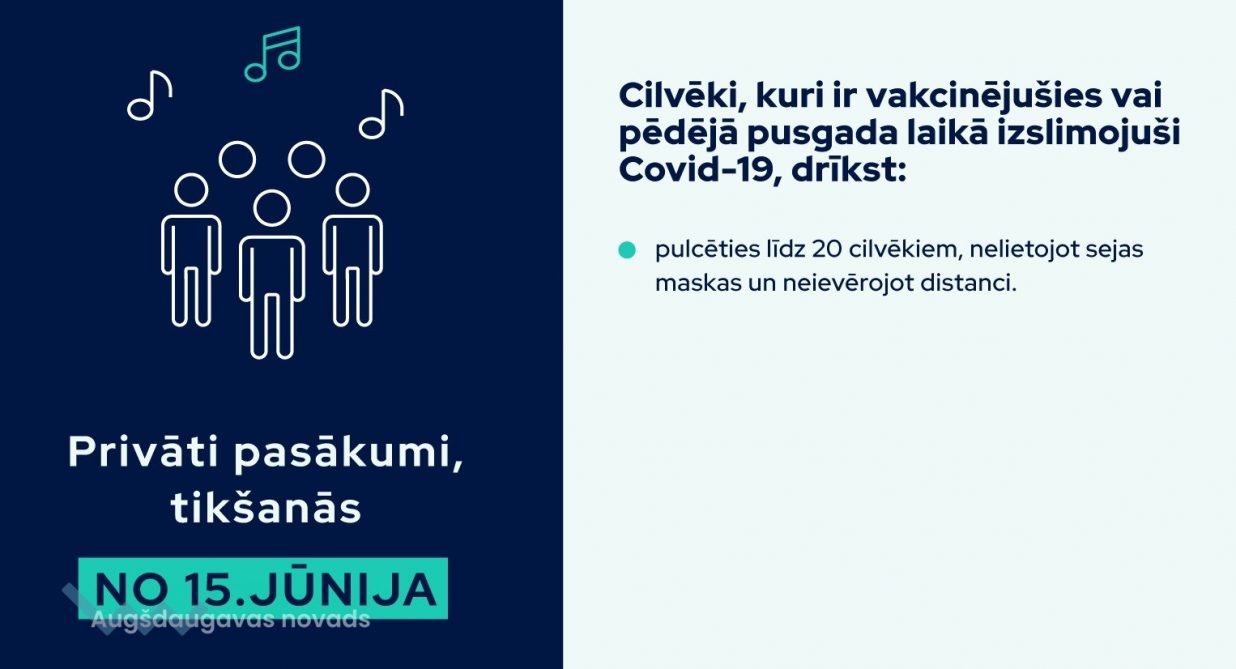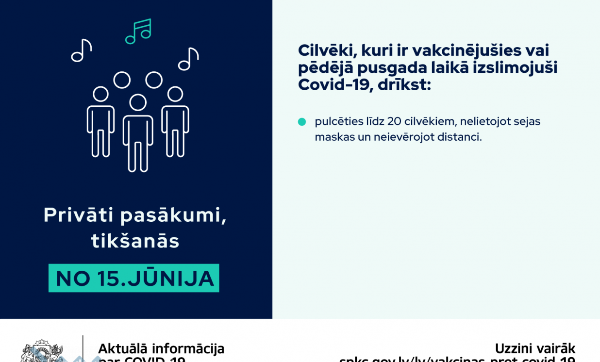 Ministru kabinets šodien, 27. maijā, atbalstīja vairākas izmaiņas, kas tostarp no 15. jūnija ļaus pulcēties vakcinētiem vai Covid-19 pārslimojušiem cilvēkiem privātos pasākumos līdz 20 cilvēkiem. Vienlaikus cilvēkiem, kas nav vakcinējušies, drošības pasākumi tiks pakāpeniski mazināti atbilstoši iepriekš lemtajam un krītoties saslimstības līmenim.