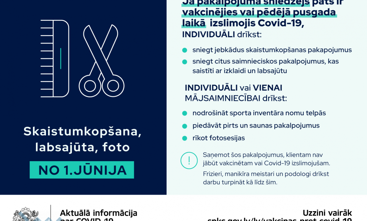 Ja pakalpojuma sniedzējs ir vakcinējies pret Covid-19 vai pēdējā pusgada laikā pārslimojis Covid-19, no 1. jūnija drīkstēs individuāli sniegt visa veida skaistumkopšanas pakalpojumus, sporta inventāra nomas un fotopakalpojumus, kā arī citus saimnieciskos pakalpojumus klātienē, kas saistīti ar izklaidi un labsajūtu. Tas nozīmē, ka telpā atrodas tikai pakalpojuma sniedzējs un viens klients (sporta inventāra nomas, pirts, saunas un fotopakalpojumu gadījumā viens pakalpojumu sniedzējs un viena mājsaimniecība). Šajā gadījumā klientiem nav jābūt vakcinētiem.