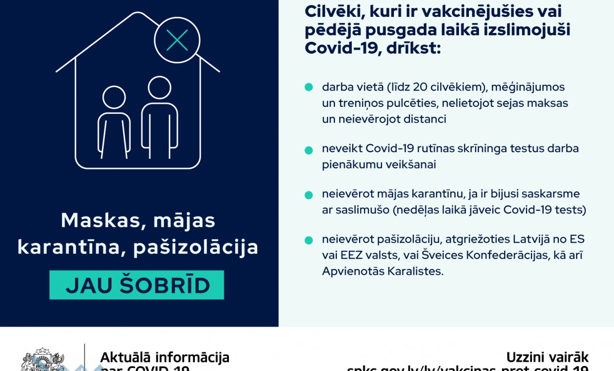 Jau šobrīd cilvēki, kuri ir vakcinēti vai pārslimojuši Covid-19, darba vietā (līdz 20 cilvēkiem), mēģinājumos un treniņos drīkst pulcēties, nelietojot sejas maskas un neievērojot distanci. Tāpat nav jāveic Covid-19 rutīnas skrīninga testi darba pienākumu veikšanai. Ja ir bijusi saskarsme ar Covid-19 saslimušo, var neievēro mājas karantīnu (nedēļas laikā jāveic Covid-19 tests). Pašizolāciju nav jāievēro, atgriežoties Latvijā no Eiropas Savienības vai Eiropas Ekonomikas zonas valsts, vai Šveices Konfederācijas, kā arī Apvienotās Karalistes.