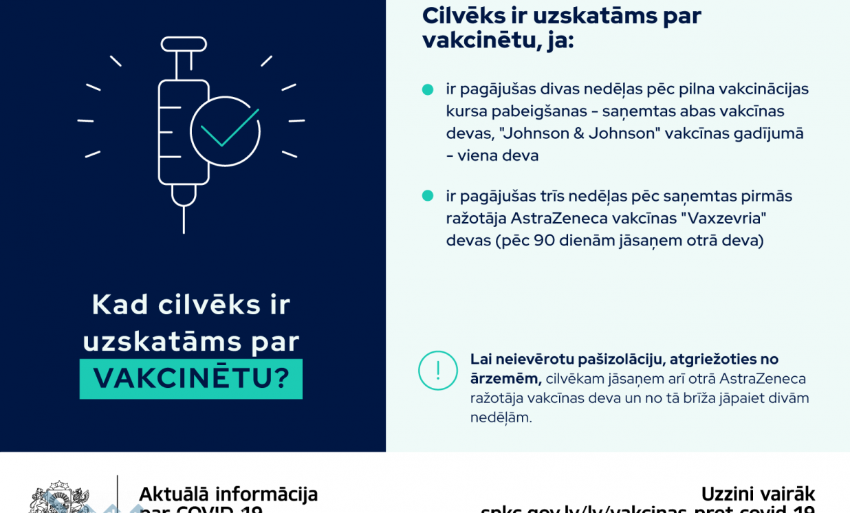 Aicinām ikvienu, kurš to vēl nav izdarījis, pieteikties savai vakcīnai pret Covid-19 vietnē manavakcina.lv, pa tālruni 8989, pie sava ģimenes ārsta vai darba devēja. Galvenais vakcinācijas mērķis ir pasargāt cilvēku no smagas saslimšanas ar Covid-19 un nāves.