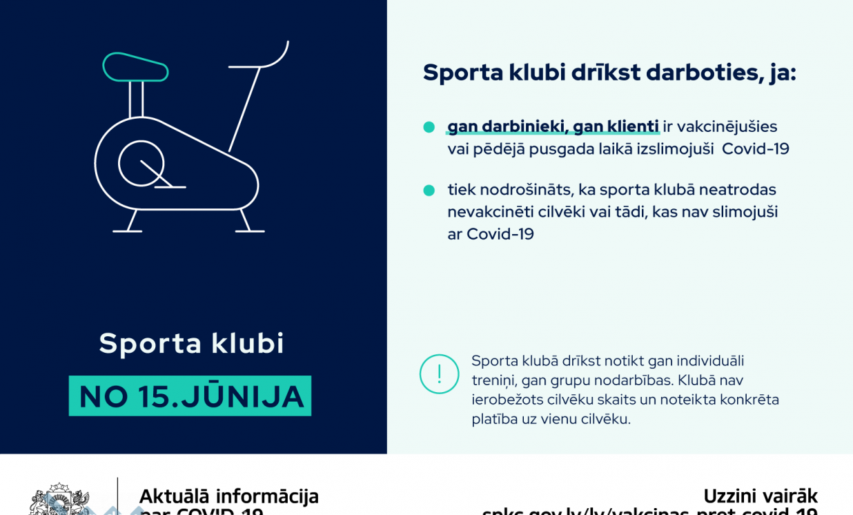 Tāpat cilvēki, kuri būs vakcinējušies pret Covid-19 vai to pārslimojuši, no 15. jūnija varēs apmeklēt sporta klubus, gan trenējoties individuāli, gan apmeklējot grupu nodarbības. Telpā nedrīkstēs atrasties nevakcinēti cilvēki vai tādi, kas pēdējā pusgadā nav slimojuši ar Covid-19.