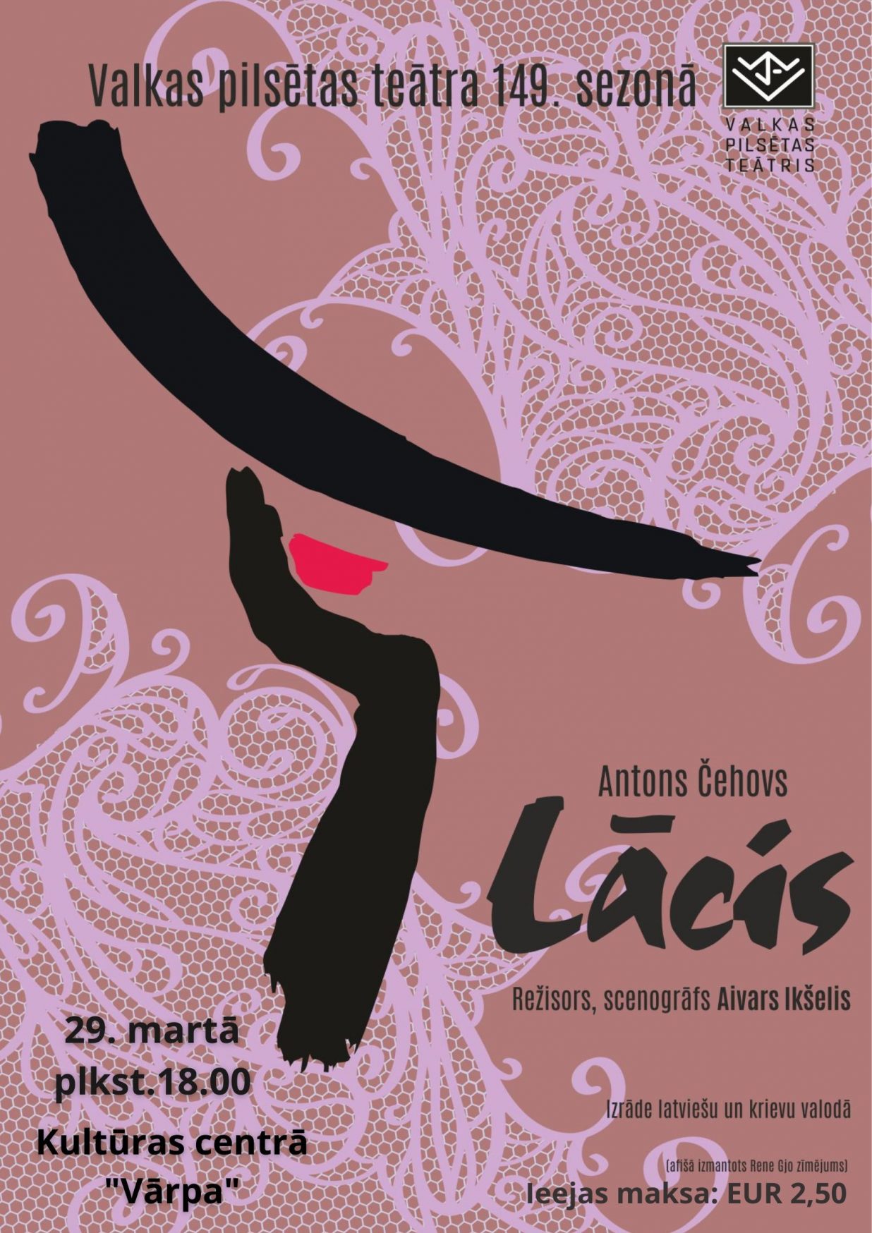 29. martā plkst. 18. 00 Kultūras centrā “Vārpa” Valkas pilsētas teātris skatītājiem piedāvā iestudējumu pēc Antona Čehova viencēliena “Lācis” motīviem.