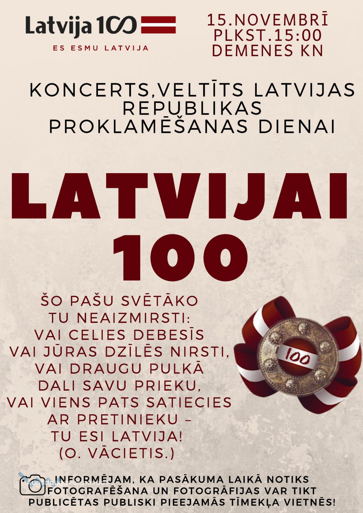 2018. gada 15. novembrī plkst. 15.00 Demenes Kultūras namā notiks koncerts, veltīts Latvijas republikas proklamēšanas dienai “Latvijai 100”.
