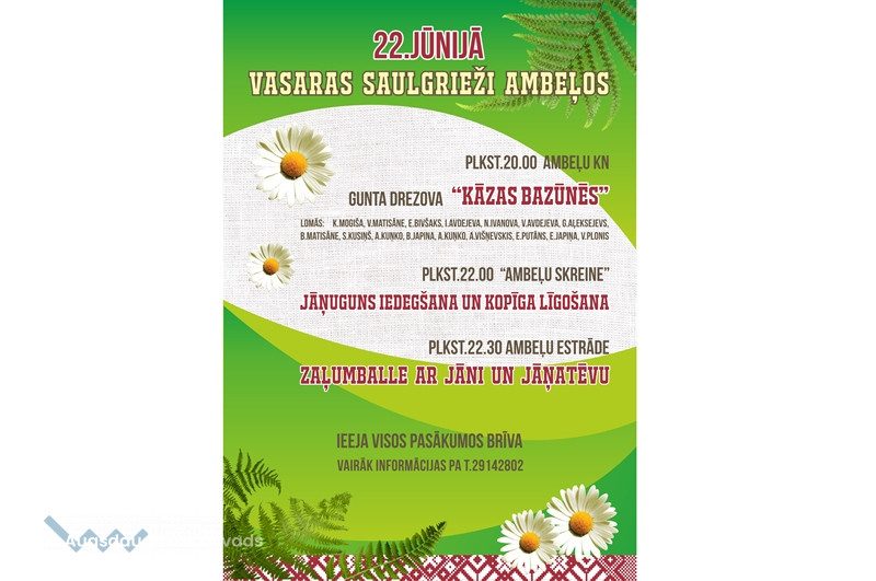 22. jūnijā Ambeļos Jāņuguns iedegšana, zaļumballe un Ambeļu teātra draugu kopas pirmizrāde "Kāzas bazūnēs". Svinēšana jau no plkst. 20.00!