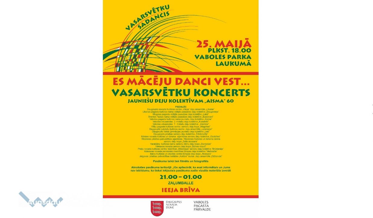 Sestdien, 25.maijā, Vaboles parka laukumā notiks Daugavpils novada tautas deju kolektīvu Vasarsvētku sadancis un Vaboles kultūras nama jauniešu deju kolektīvam “Aisma” - 60.