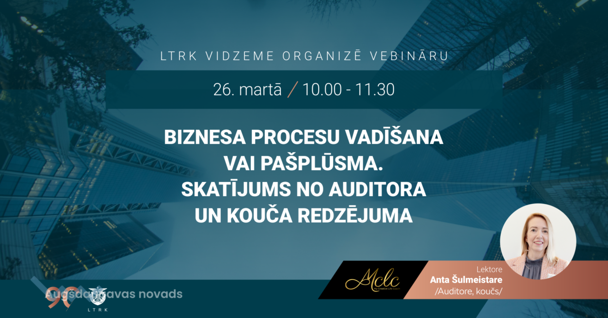 LTRK Vidzemes reģiona nodaļa aicina reģistrēties vebināram "BIZNESA PROCESU VADĪŠANA VAI PAŠPLŪSMA. SKATĪJUMS NO AUDITORA VAI KOUČA REDZĒJUMA." , kas notiks 26.03. plkst. 10:00 ZOOM