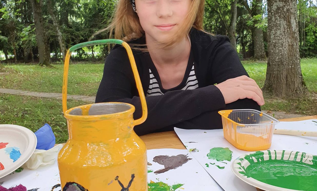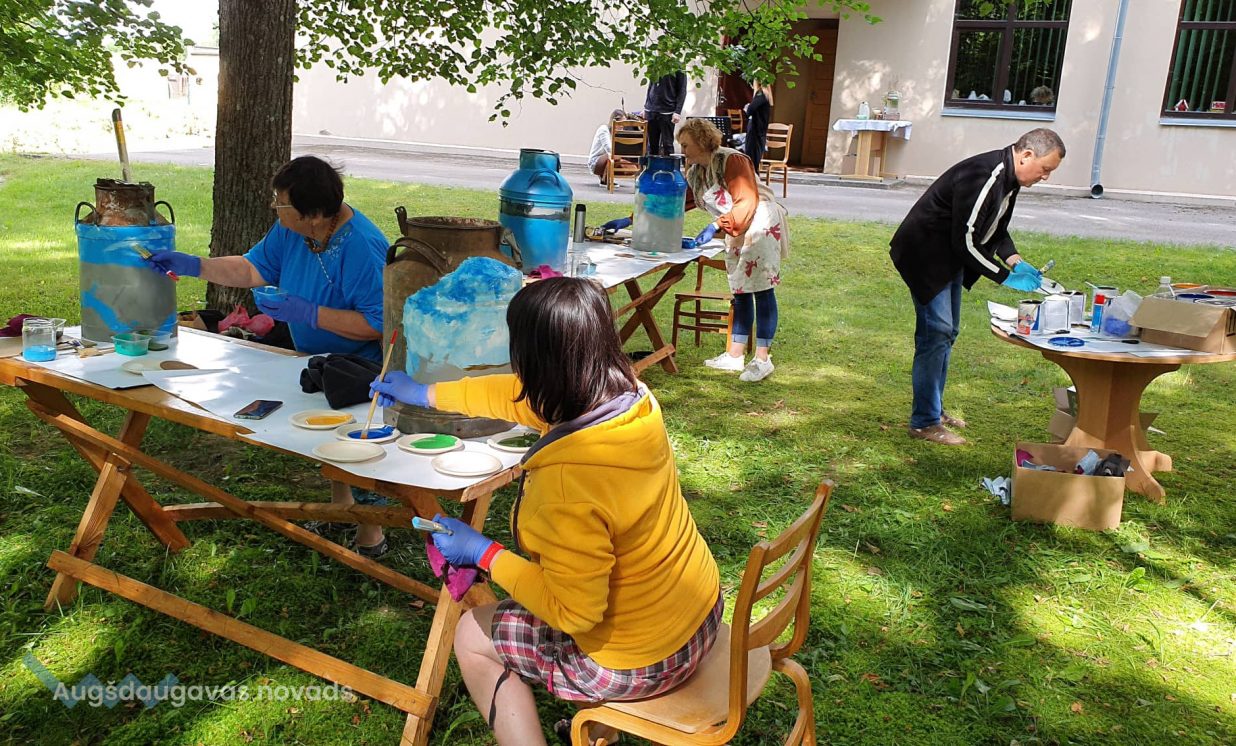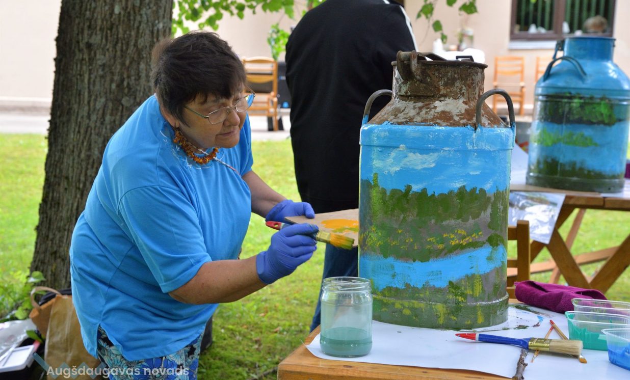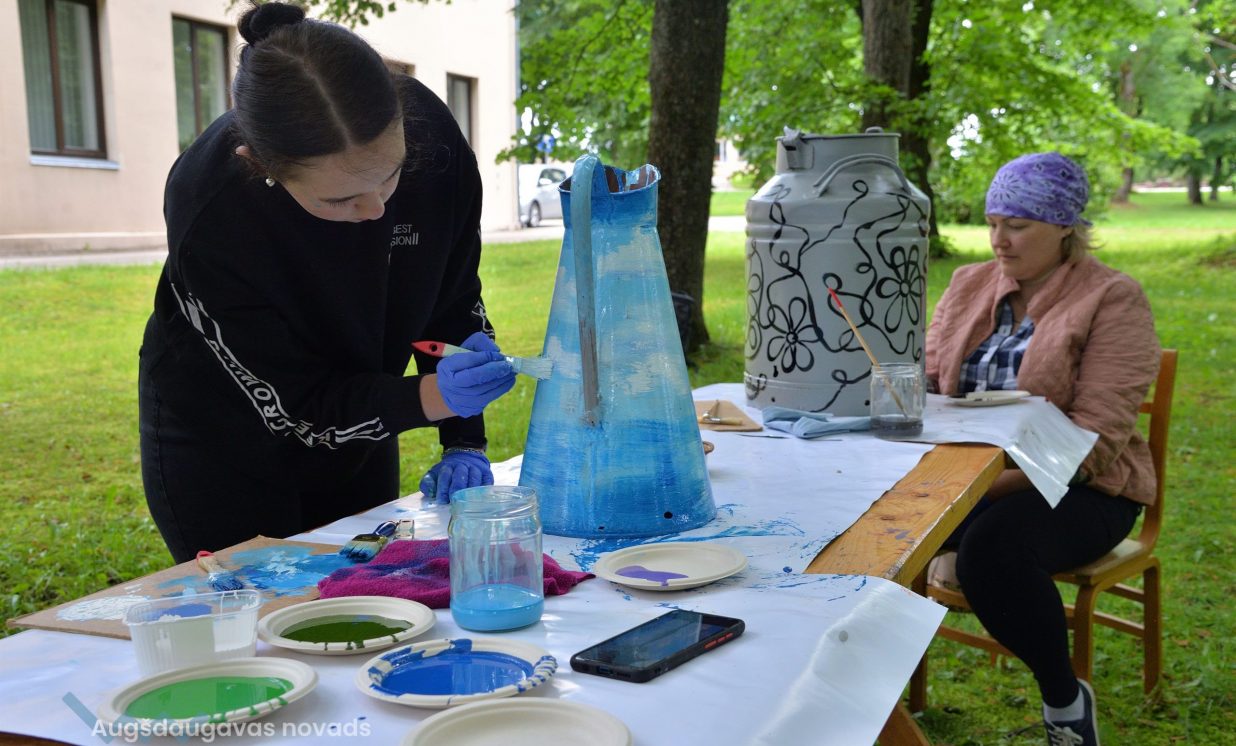Gleznošana kā vaļasprieks ir radošās darbnīcas dalībniecēm Jeļenai Požarskai un Inesei Minovai, kuras šo jomu apgūst soli pa solim pašmācības ceļā. Jeļenas izpildījumā piena kanna izplauka krāšņos ziedos, savukārt Inese uzgleznoja Medumu ezeru vakara noskaņā.