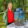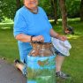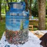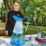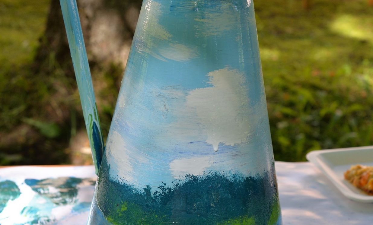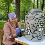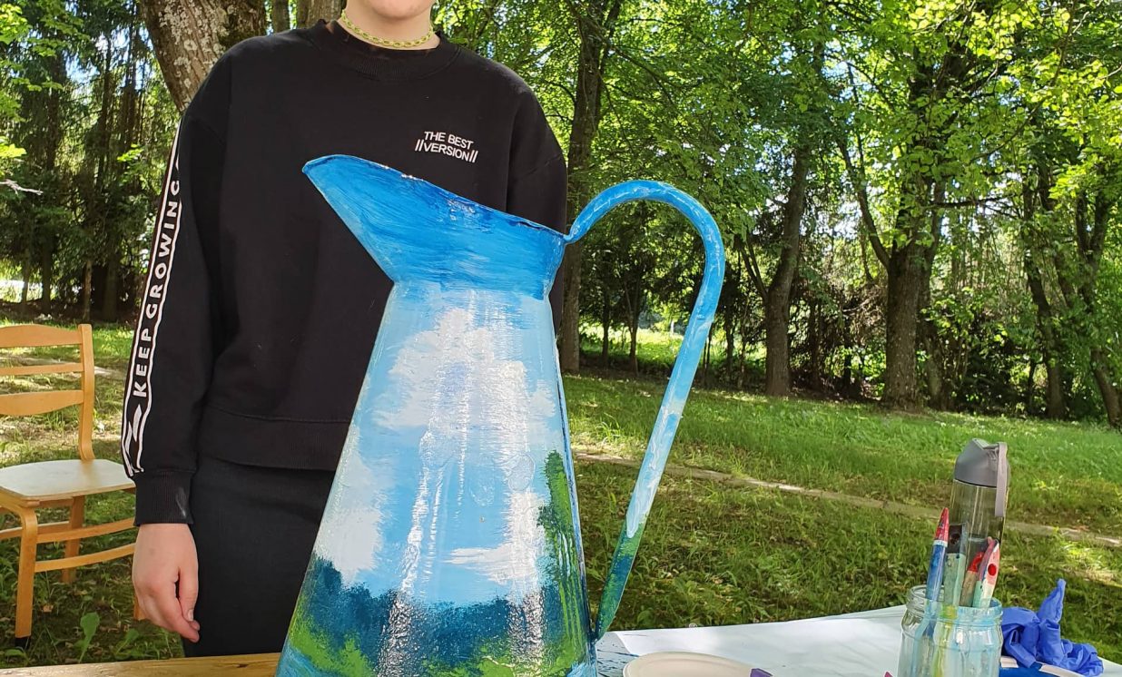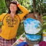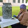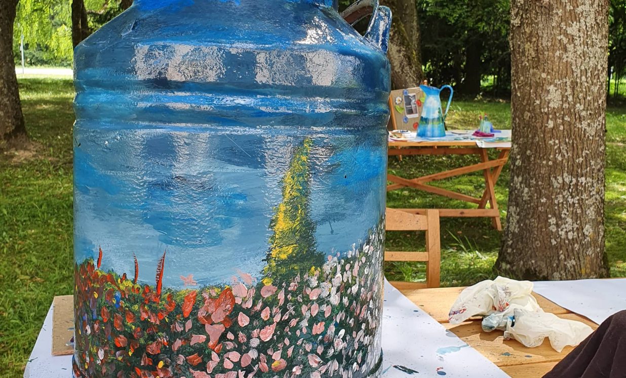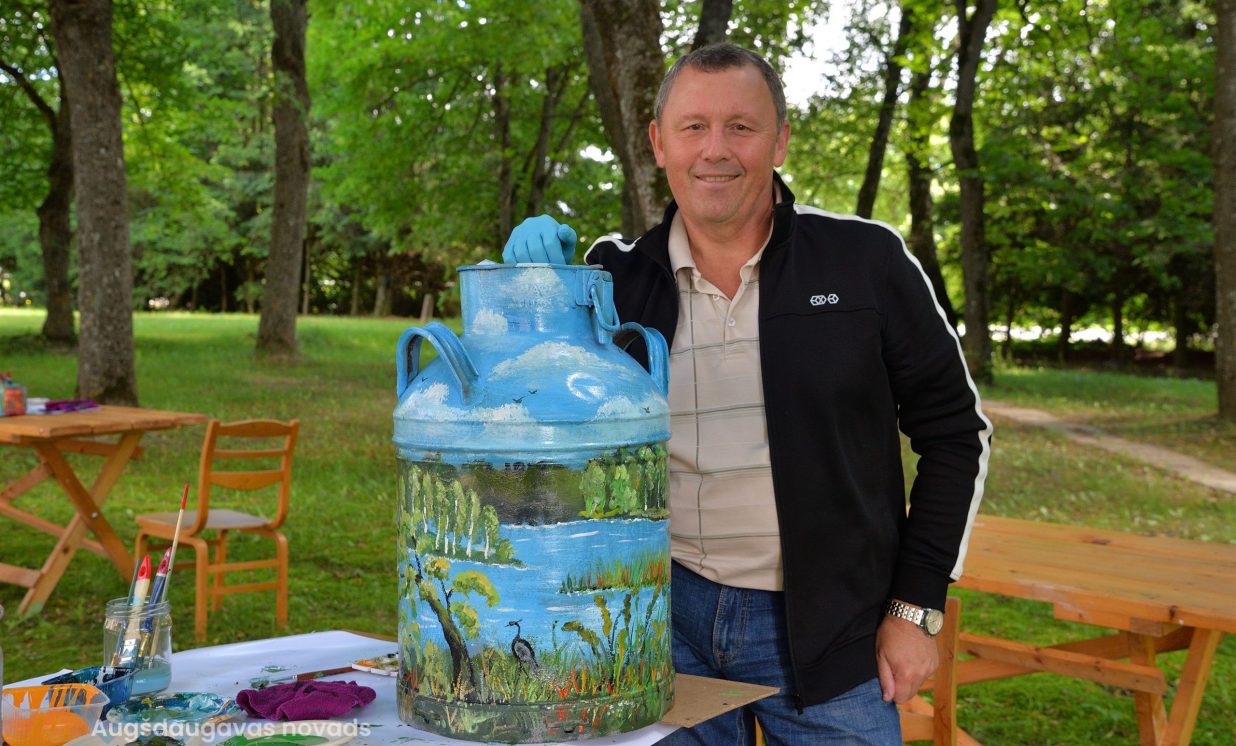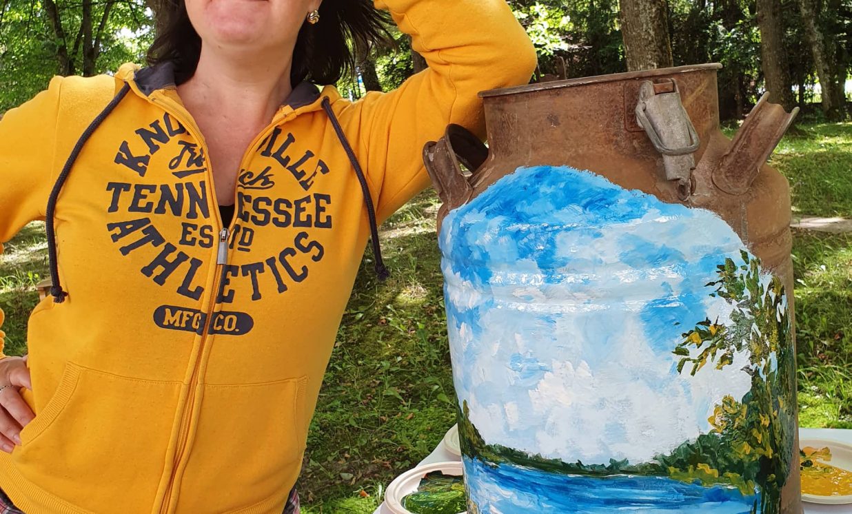 Daugavpils reģiona mākslinieku asociācijas dalībniece Natālija Krjukova iedvesmojas no apkārtējās pasaules, mūzikas un cenšas tver mirkļus, savos darbos spēlējoties ar kontrastiem un spilgtām krāsām. Uz sarūsējušās kannas virsmas viņa uzbūra nelielu ezera sonāti.